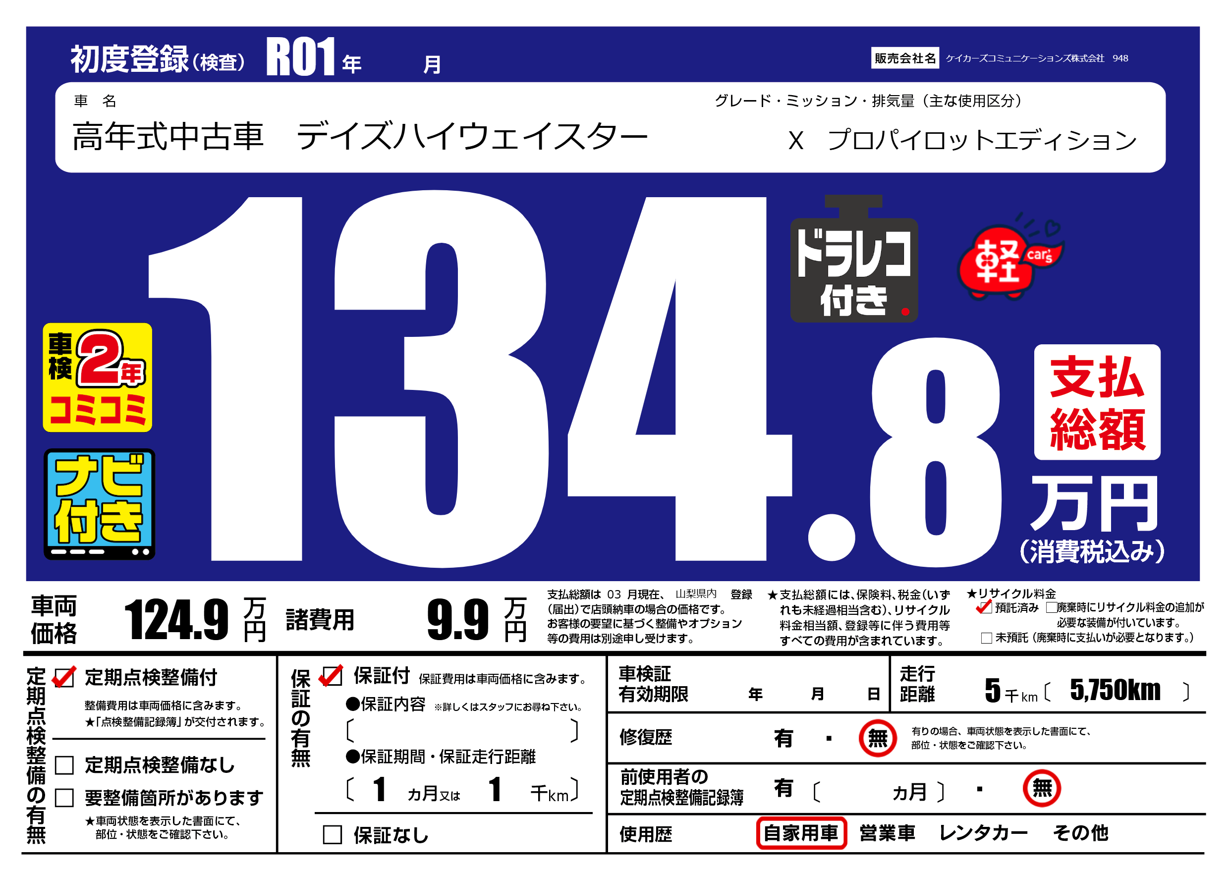 | 走行キロ | 0.5万km | 初年度登録 | R01年---月 |