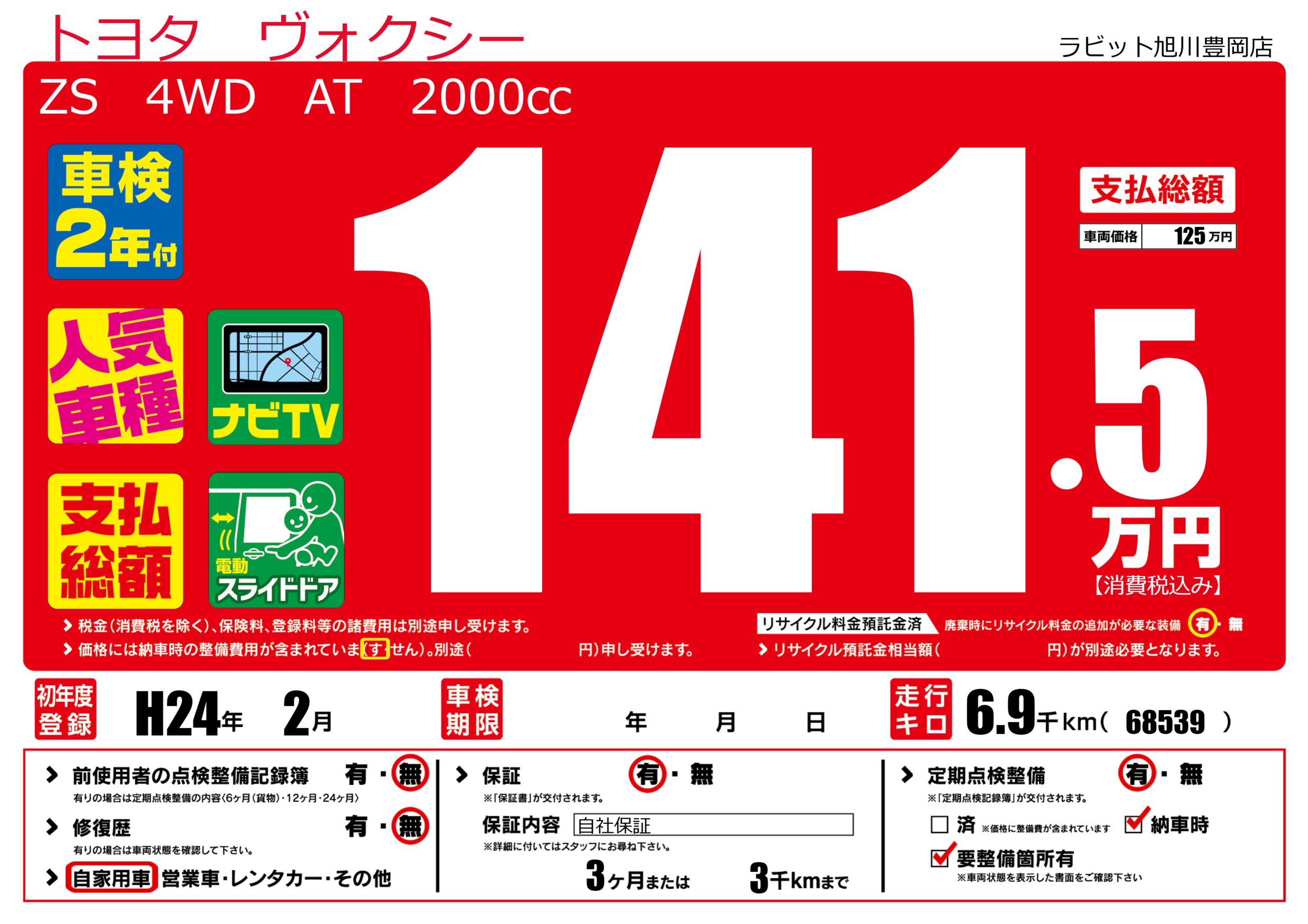 | 走行キロ | 0.6万km | 初年度登録 | H24年2月 |