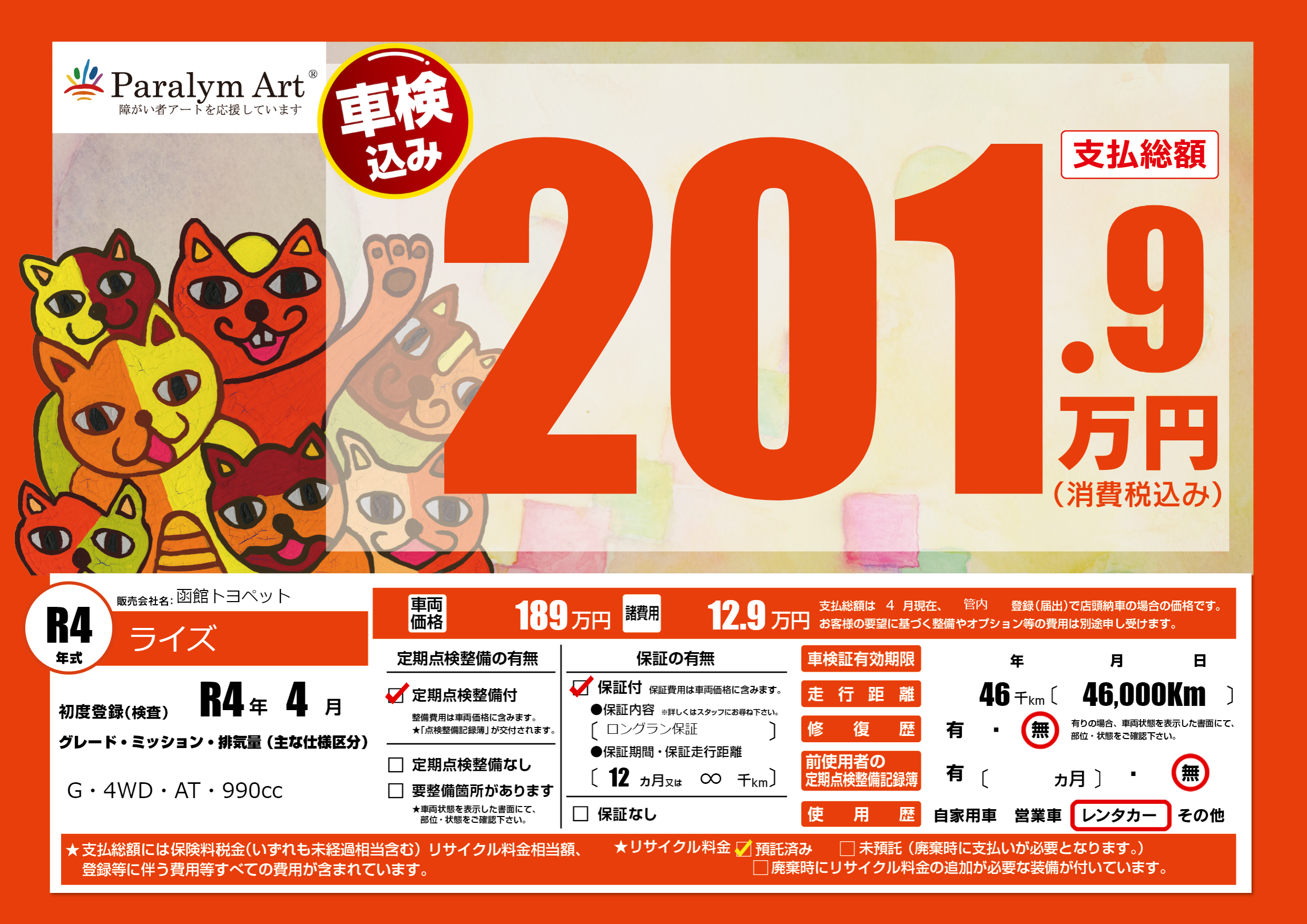 | 走行キロ | 4.6万km | 初年度登録 | R4年4月 |