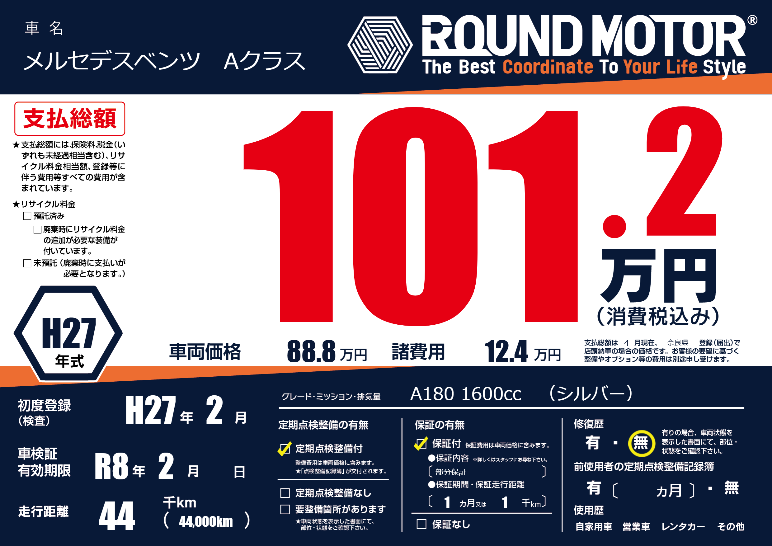 | 車名 | メルセデスベンツ Aクラス | グレード ミッション 排気量 |