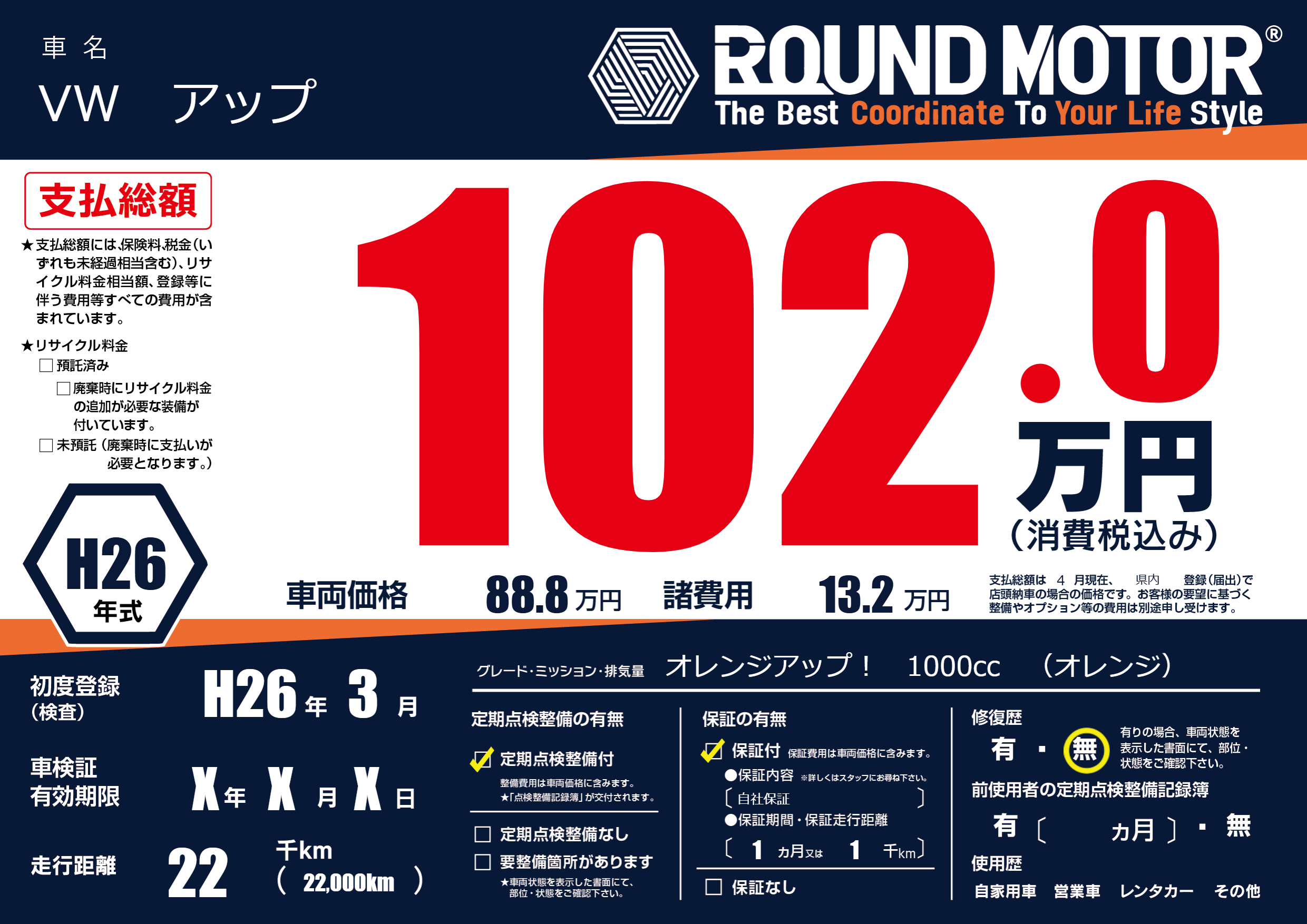 保証付き 保証内容(自社保証) 1ヶ月または(1)千kmまで |