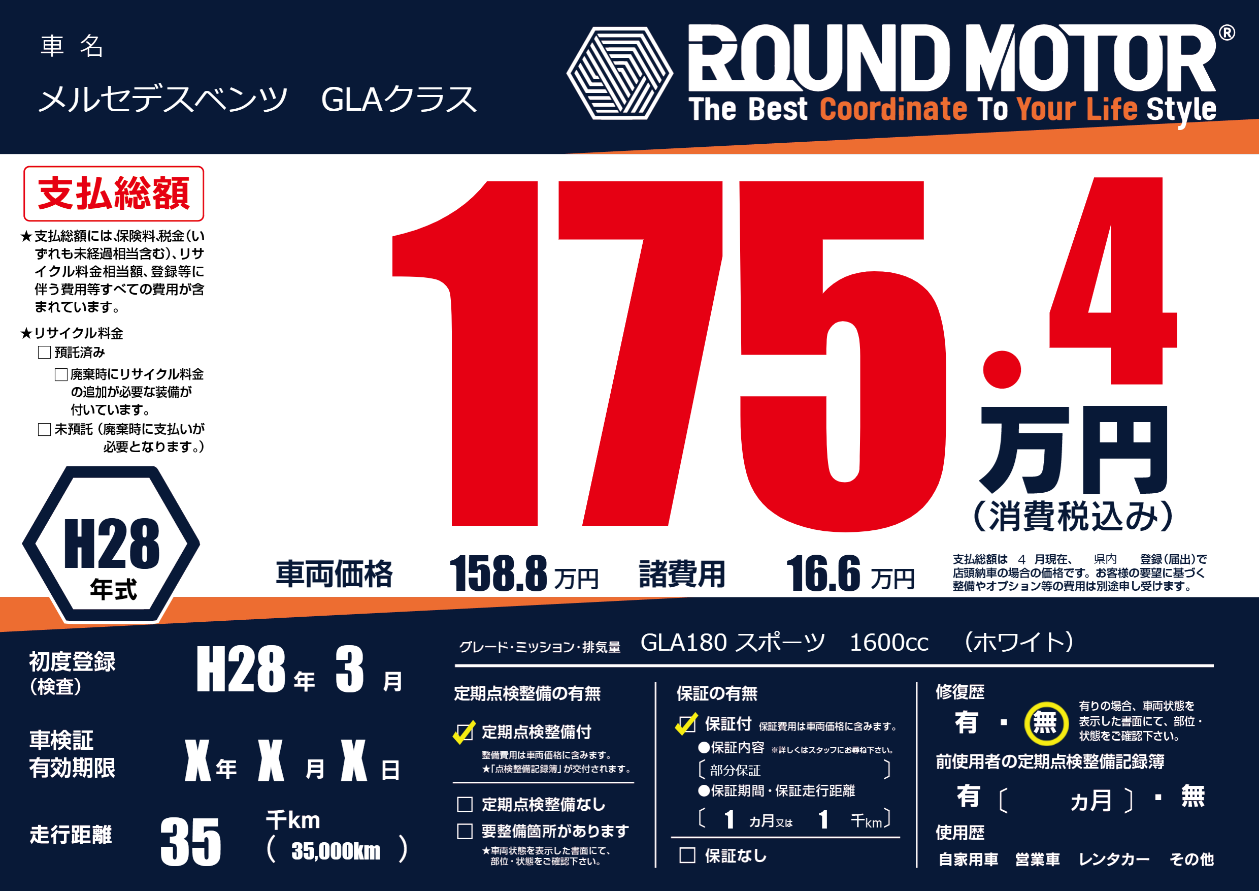| 車名 | メルセデスベンツ GLAクラス | グレード ミッション 排気量 |