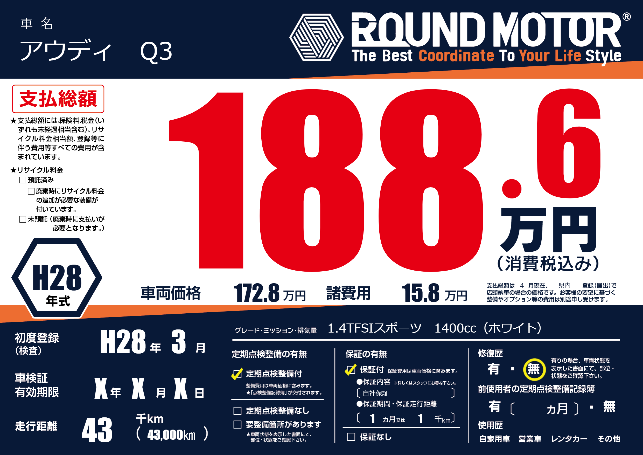 | 車名 | アウディ Q3 | グレード ミッション 排気量 |