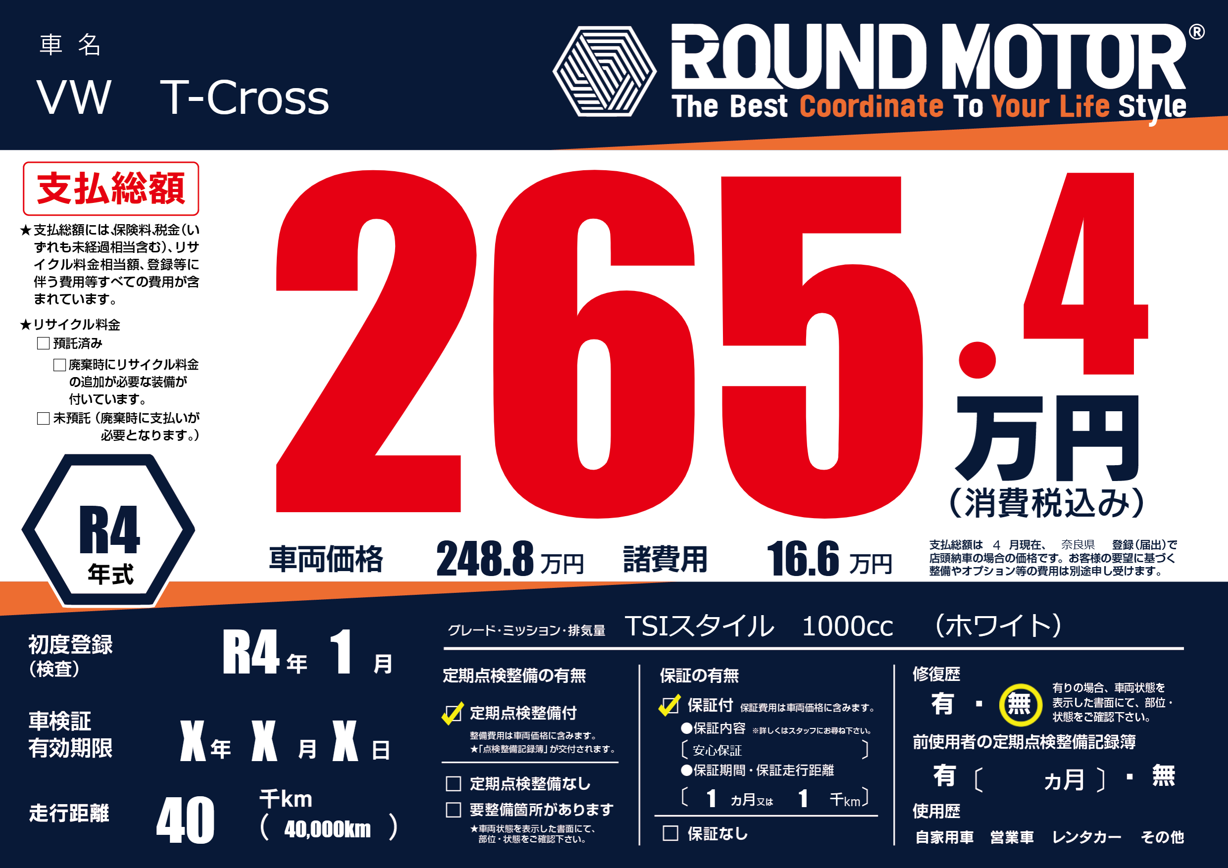 | 車名 | VW T-Cross | グレード ミッション 排気量 |