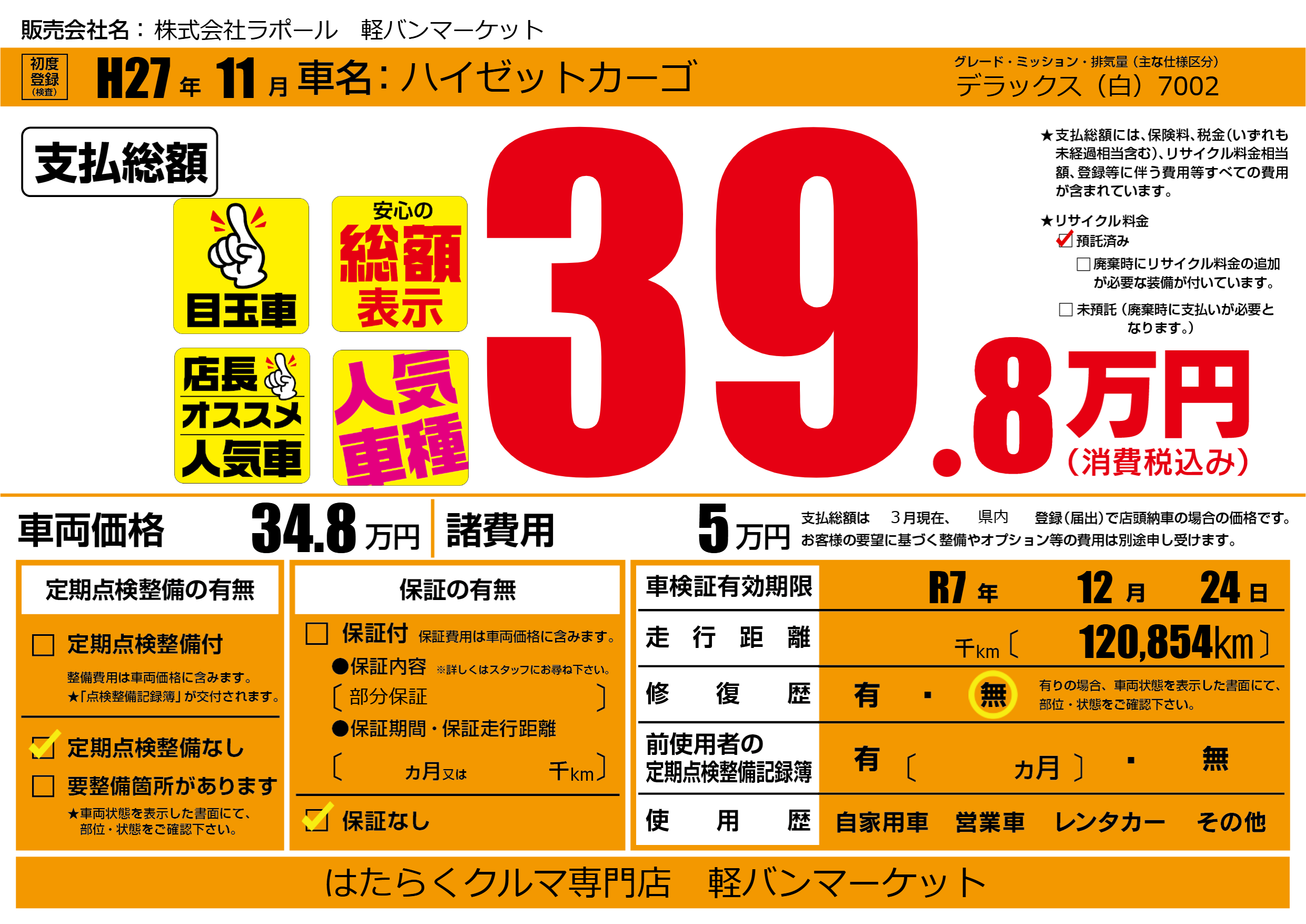 | 車名 | ハイゼットカーゴ | グレード ミッション 排気量 |