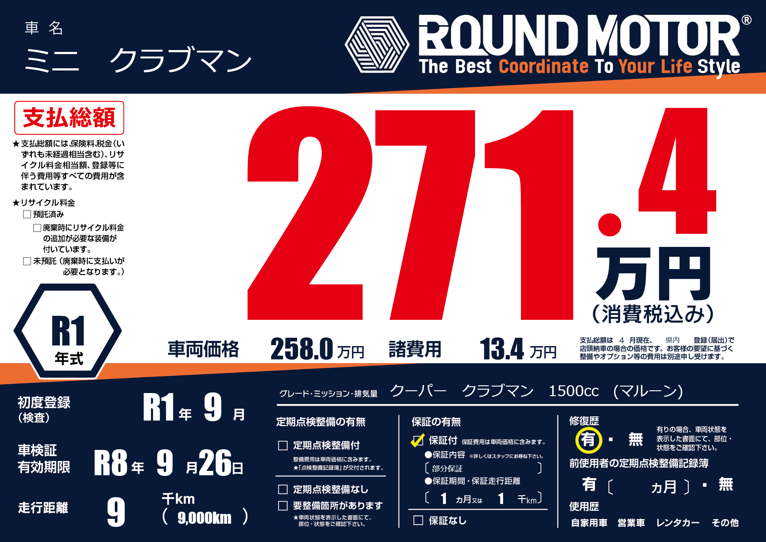 | 車名 | ミニ クラブマン | グレード ミッション 排気量 |