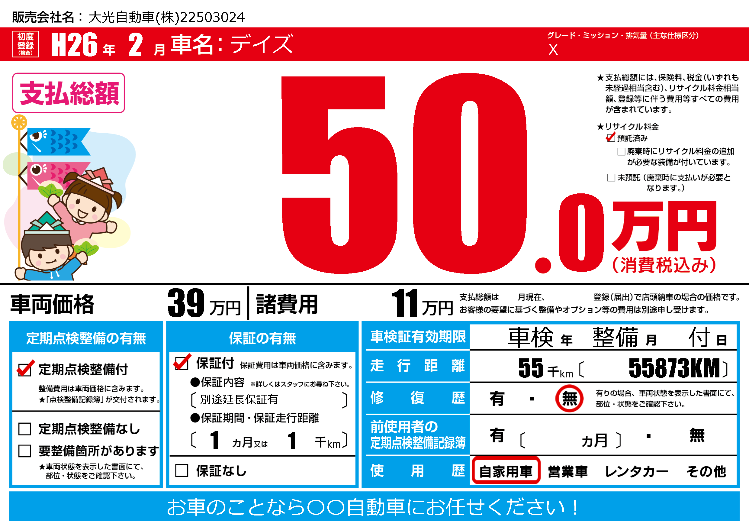 | 走行キロ | 5.5万km | 初年度登録 | H26年2月 |