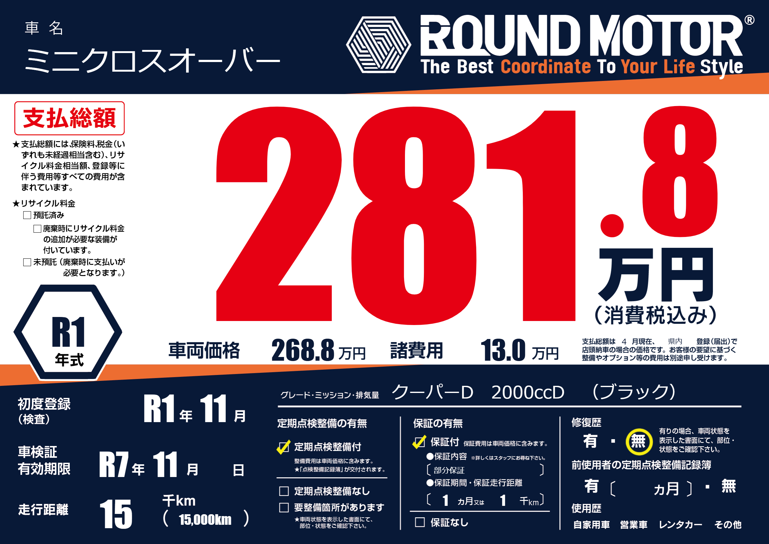 | 車検制限 | R7年 11月 - 日 | ||