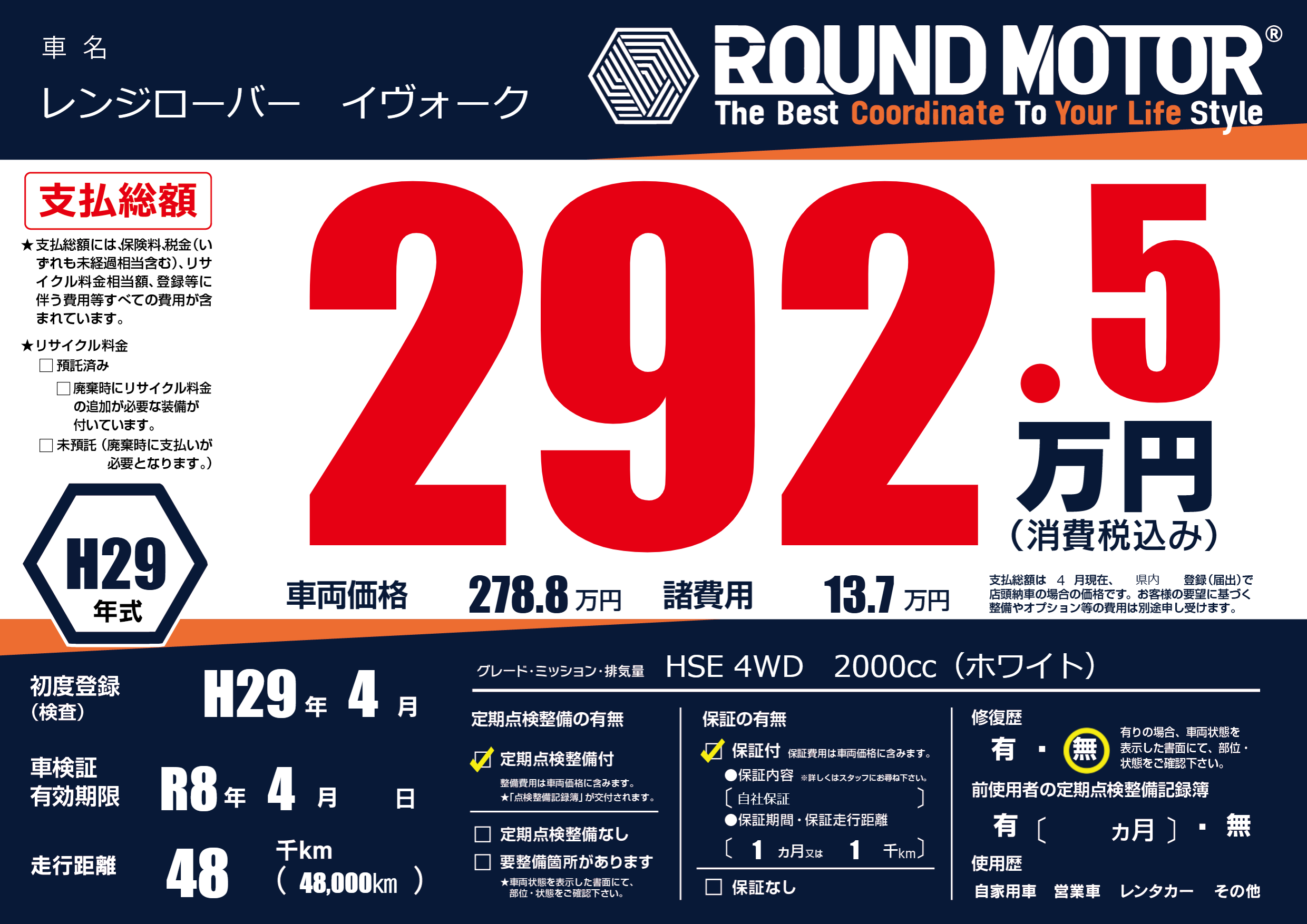 | 車名 | レンジローバー イヴォーク | グレード ミッション 排気量 |