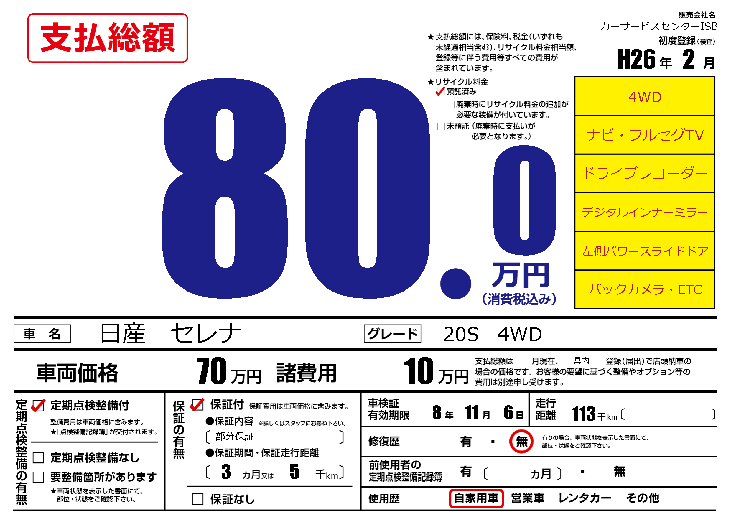| 走行キロ | 11.3万km | 初年度登録 | H26年2月 |