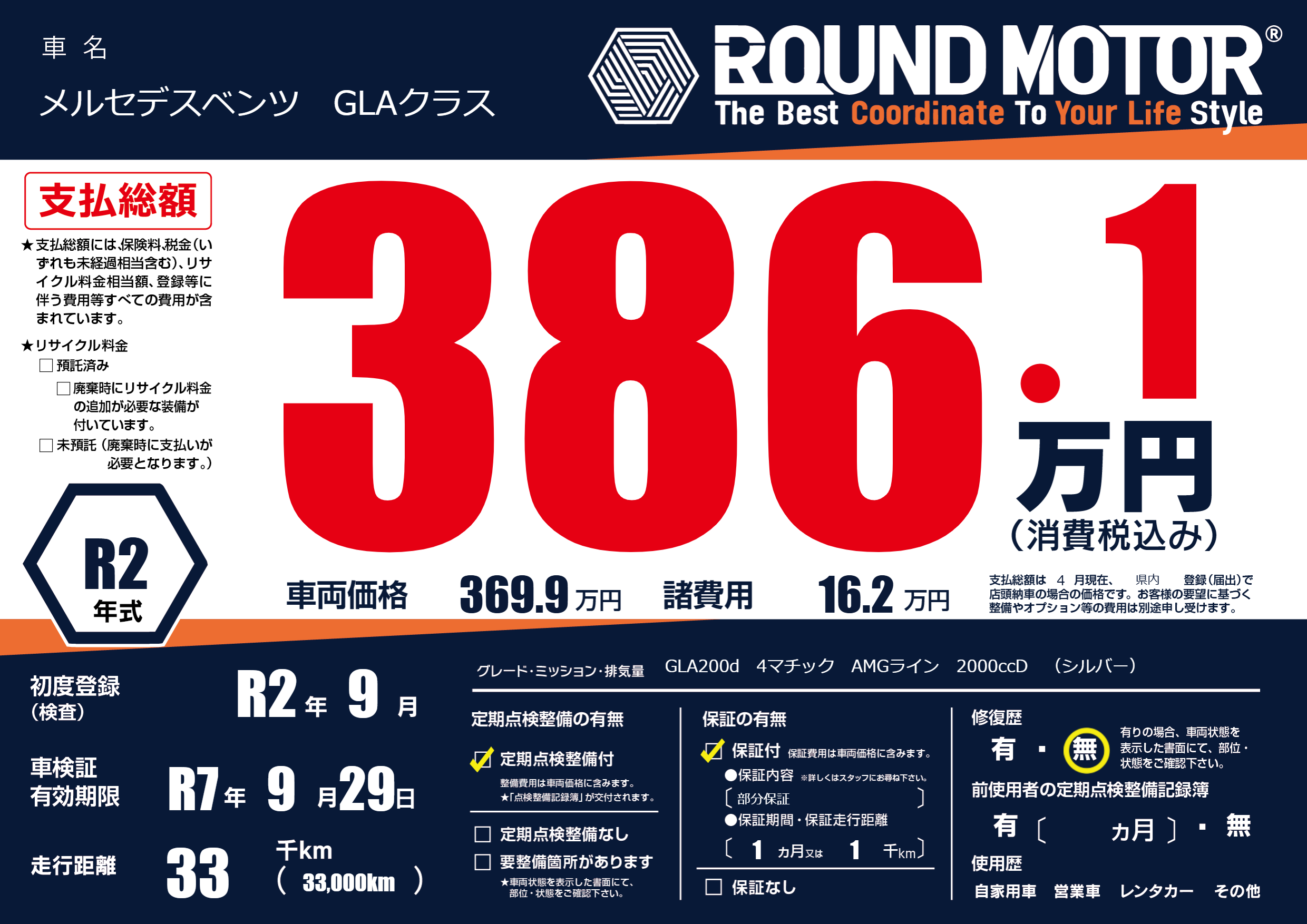 | 車名 | メルセデスベンツ GLAクラス | グレード ミッション 排気量 |