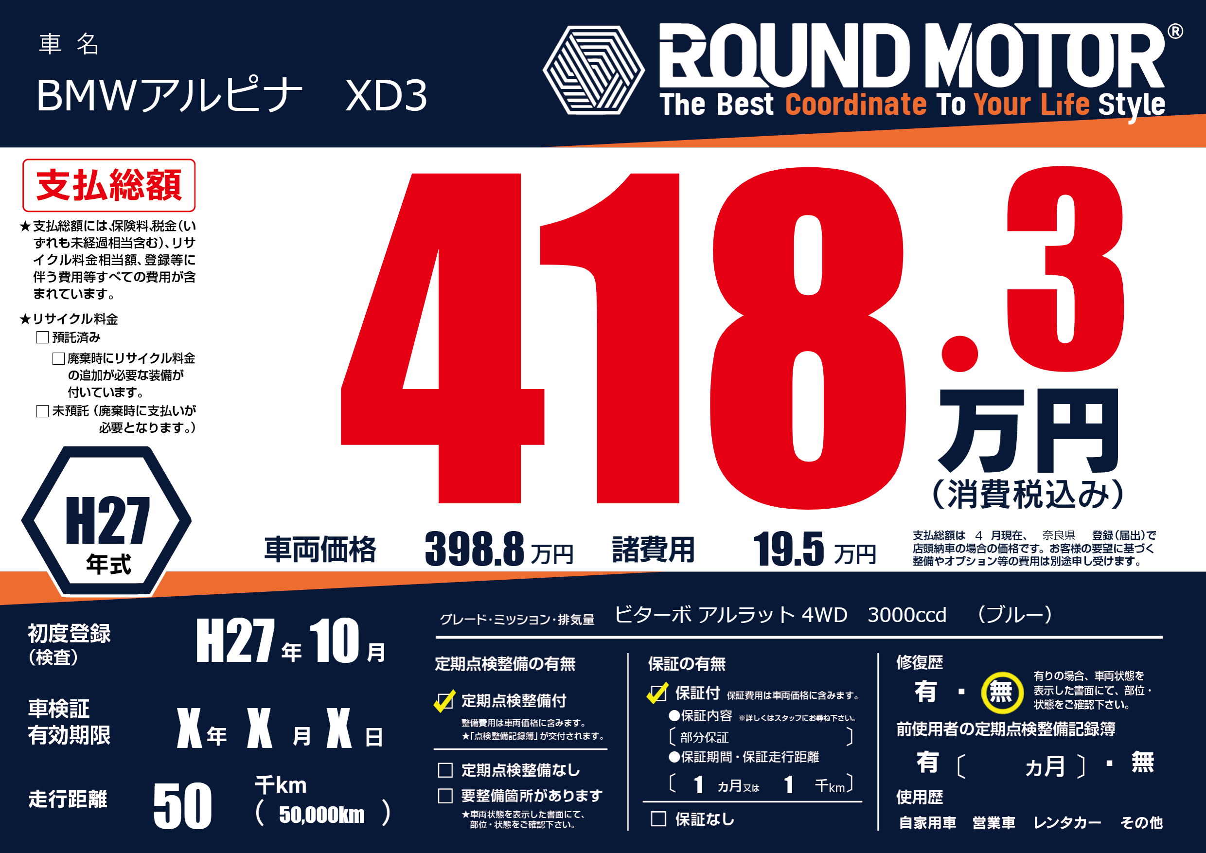 | 車名 | BMWアルピナ XD3 | グレード ミッション 排気量 |