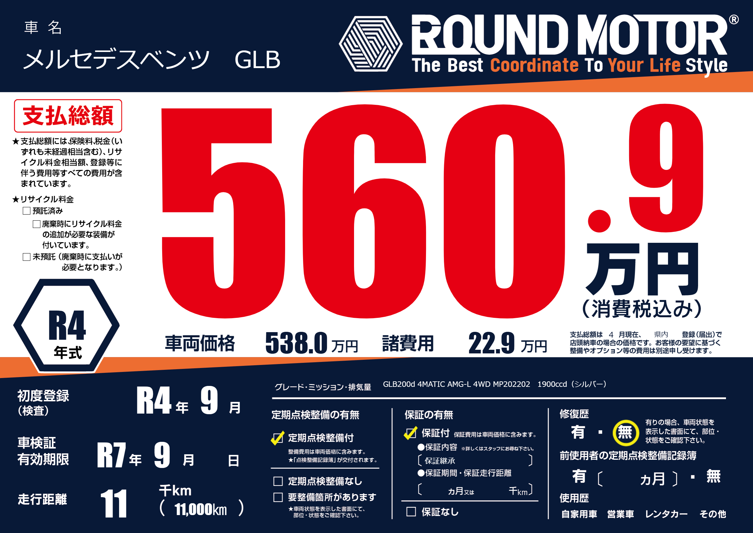 | 車名 | メルセデスベンツ GLB | グレード ミッション 排気量 |