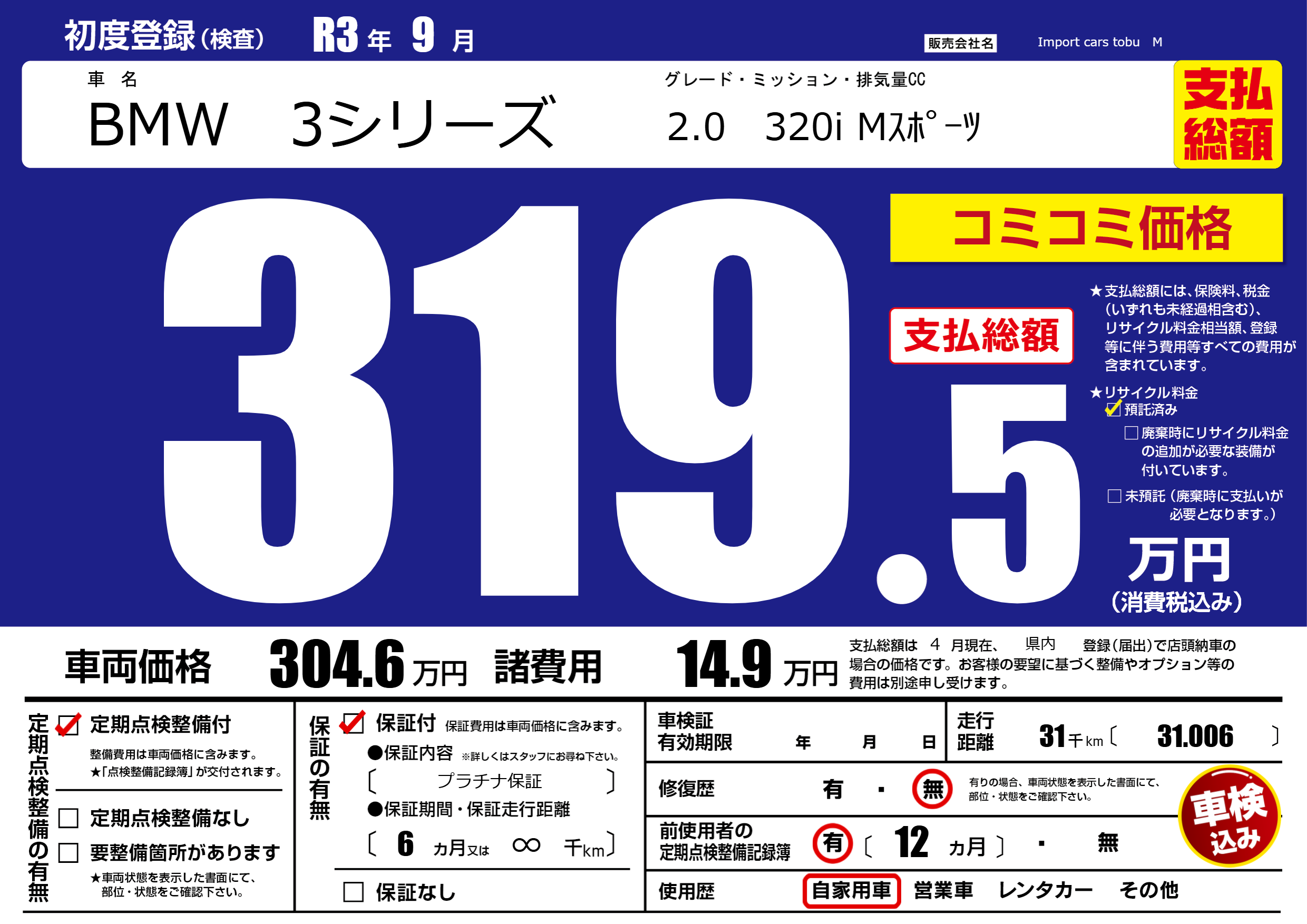 | 車名 | BMW 3シリーズ | グレード ミッション 排気量 |