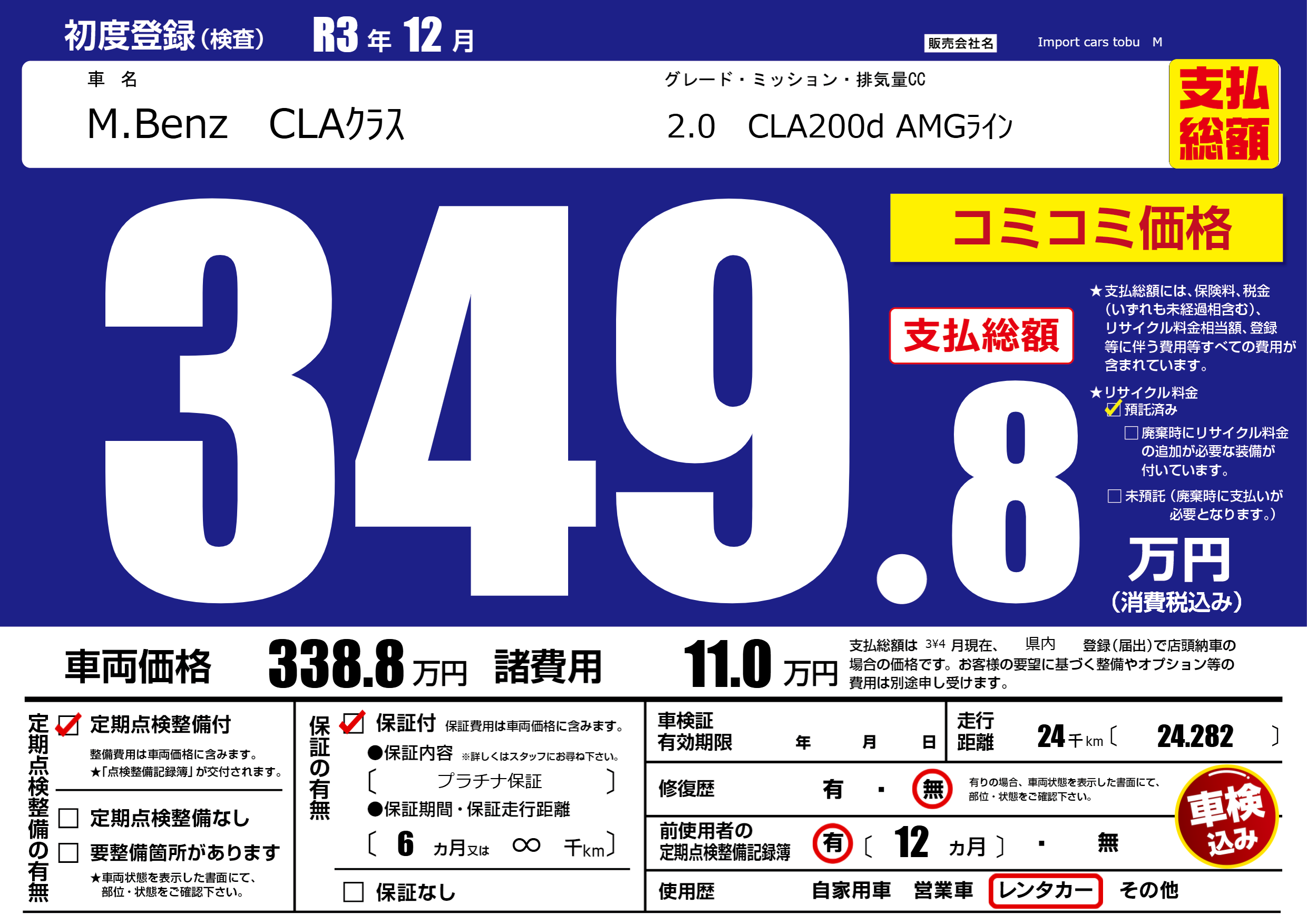 | 車名 | M.Benz CLAクラス | グレード ミッション 排気量 |