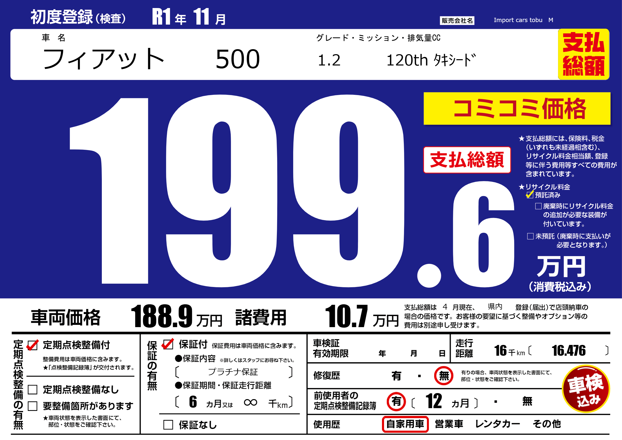 | 車名 | フィアット 500 | グレード ミッション 排気量 |