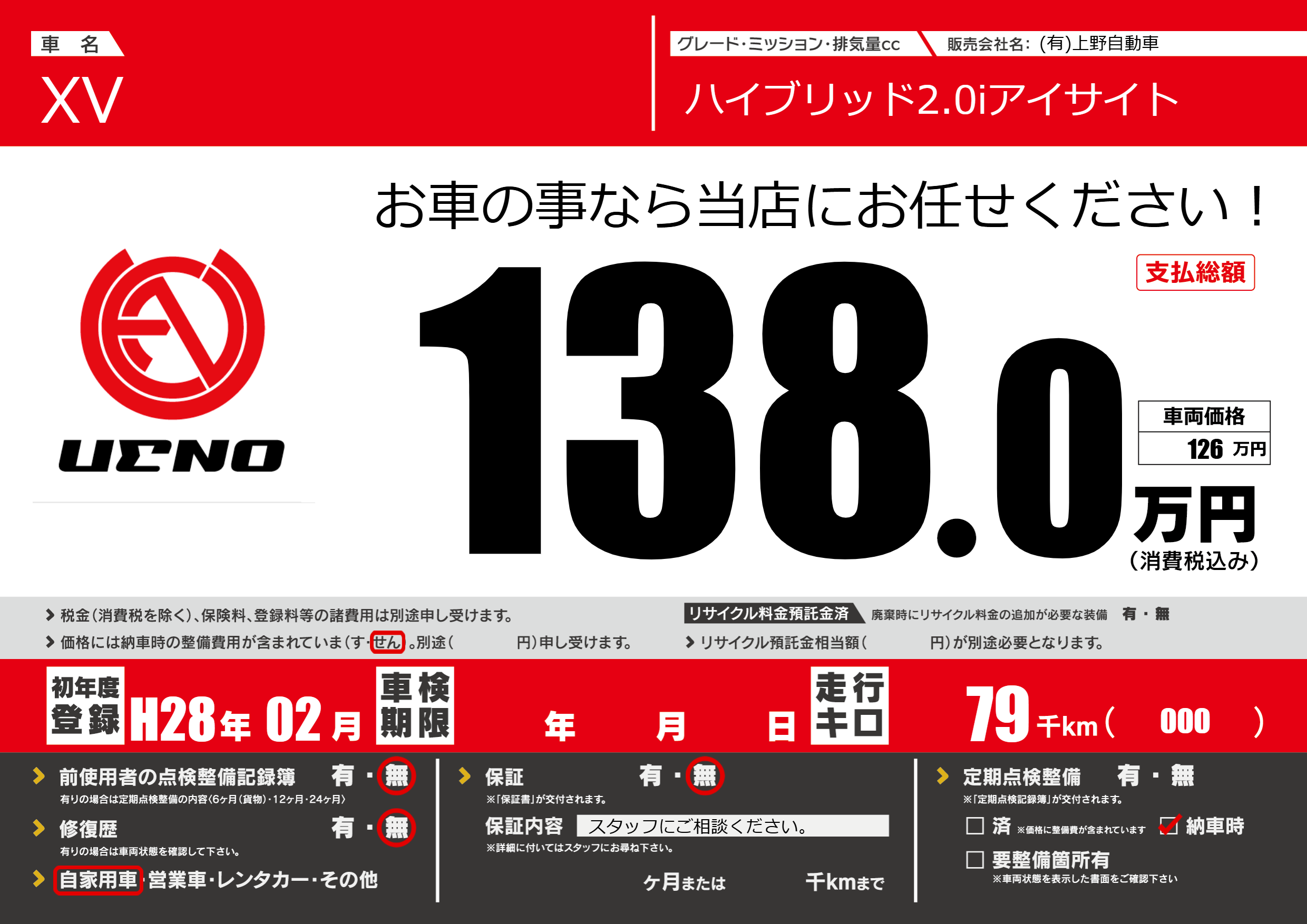 保証なし 保証内容(スタッフにご相談ください。) ---ヶ月または()千kmまで |