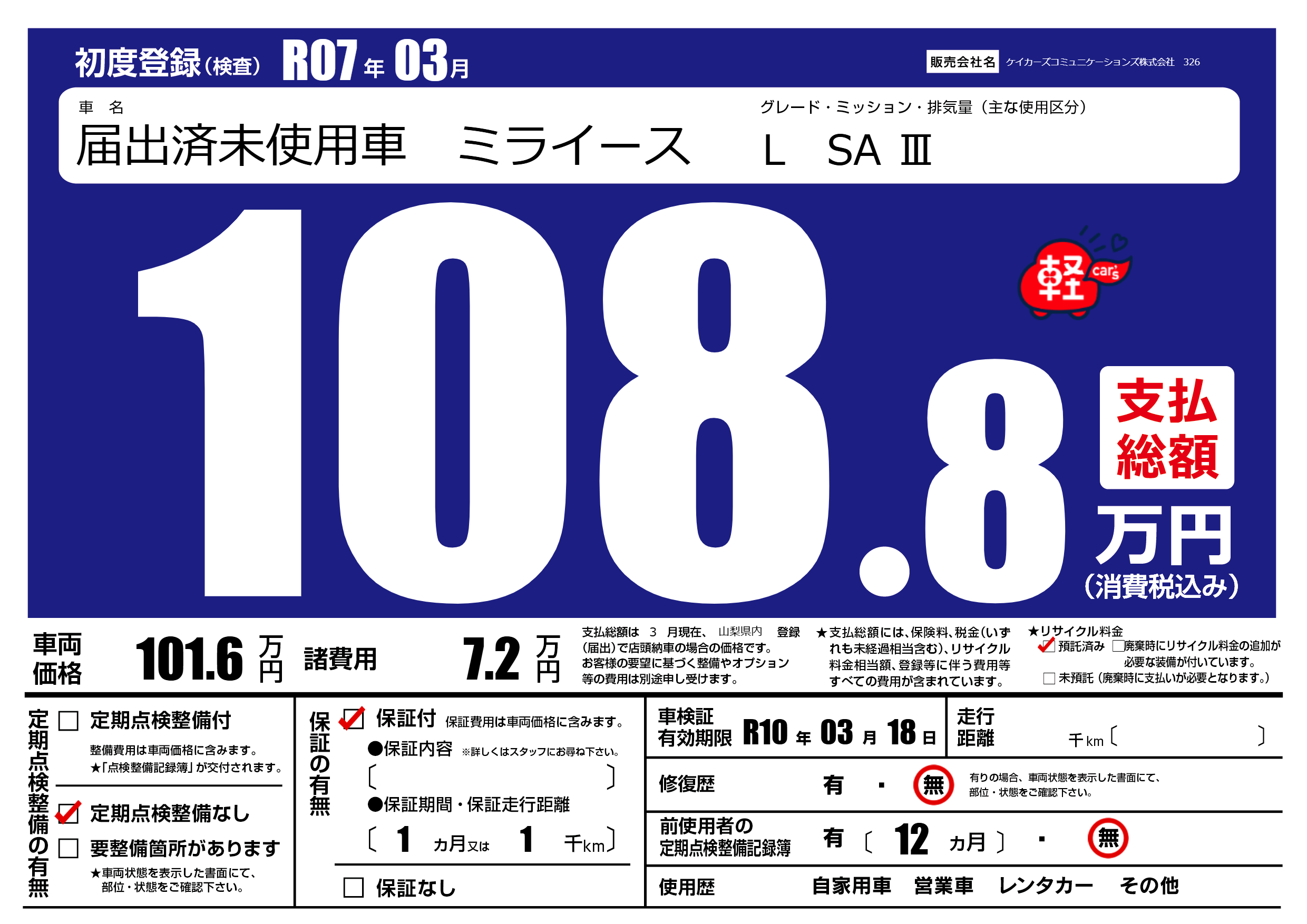 | 走行キロ | - | 初年度登録 | R07年03月 |
