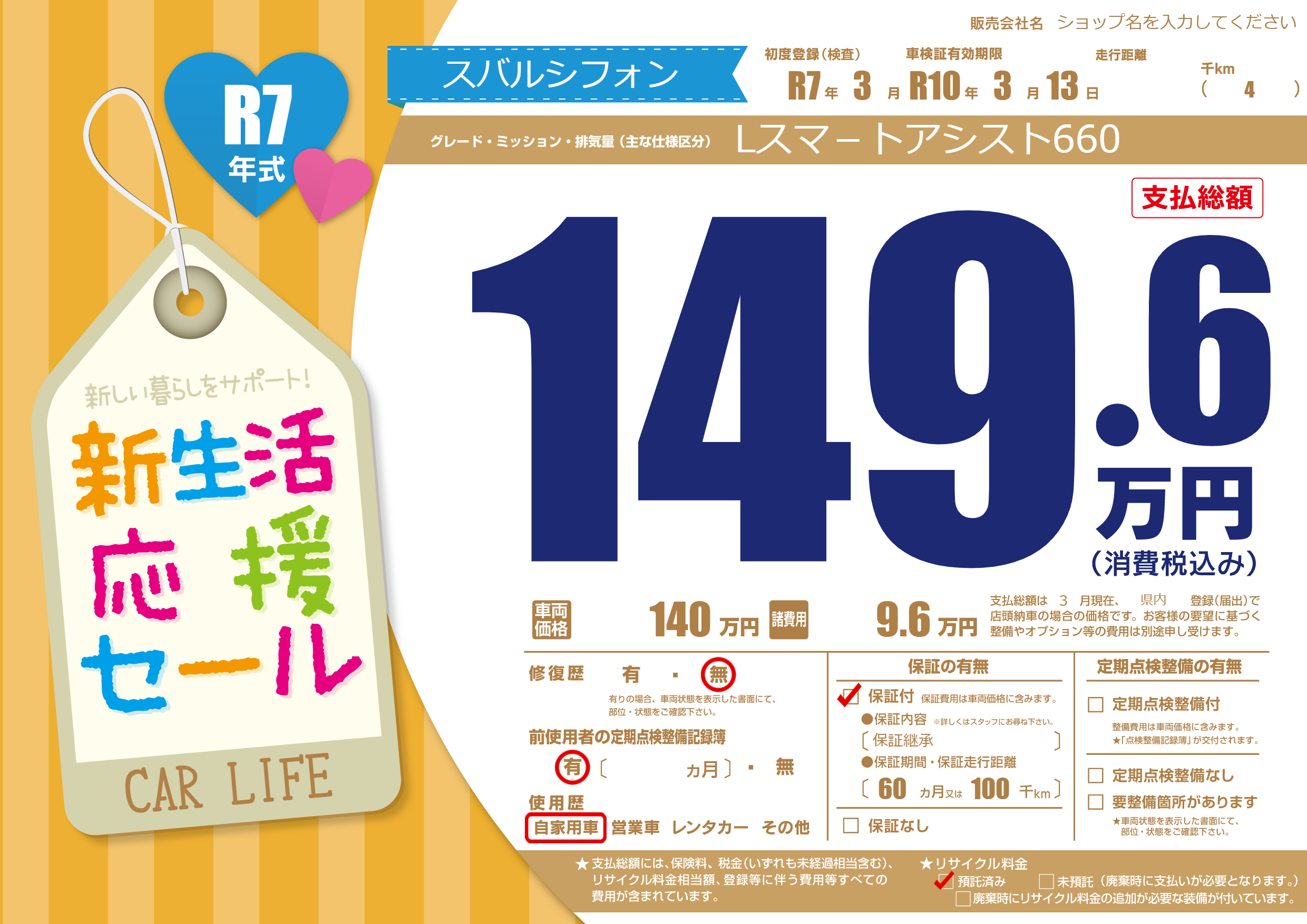 保証付き 保証内容(保証継承) 60ヶ月または(100)千kmまで |