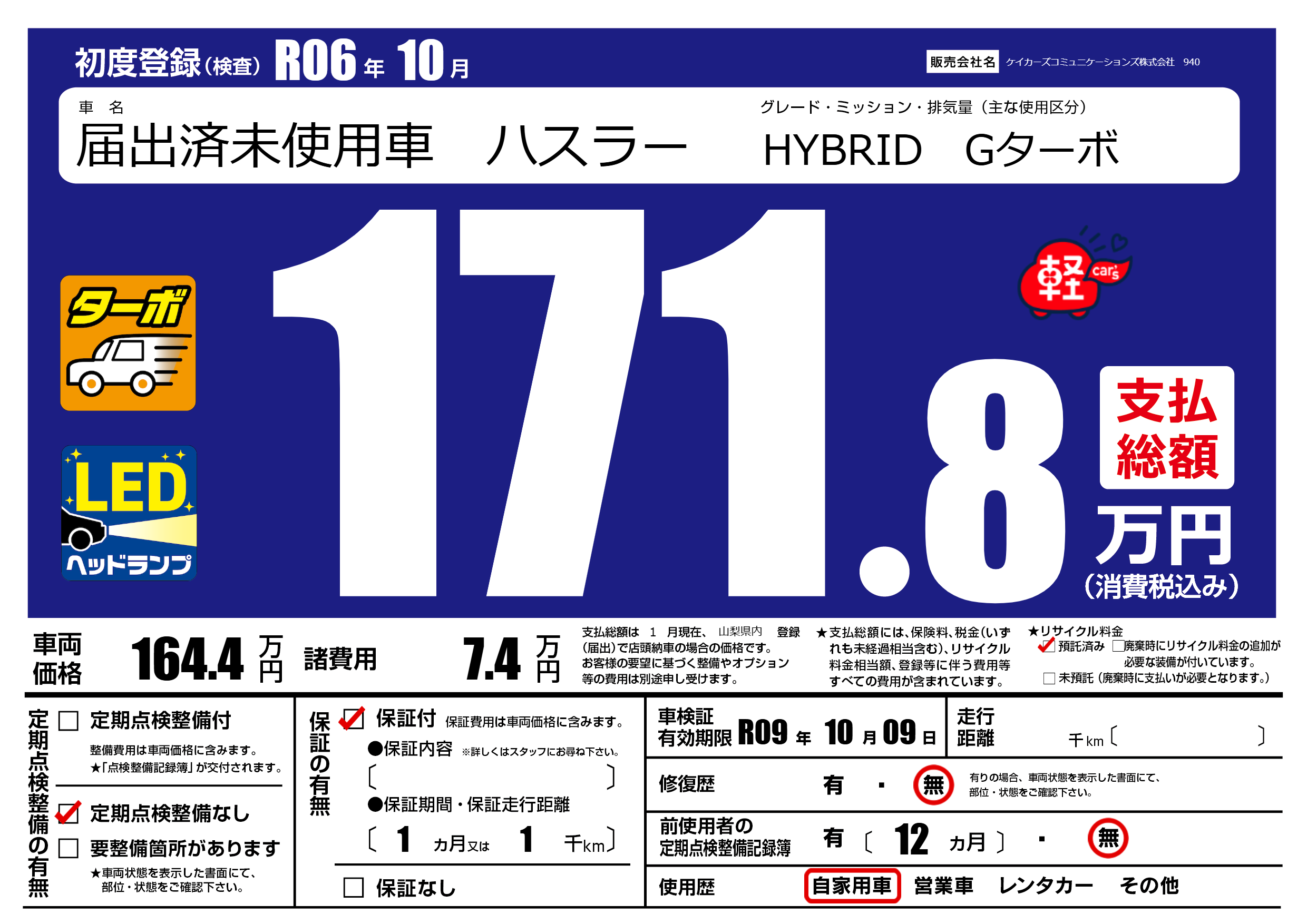 | 走行キロ | - | 初年度登録 | R06年10月 |
