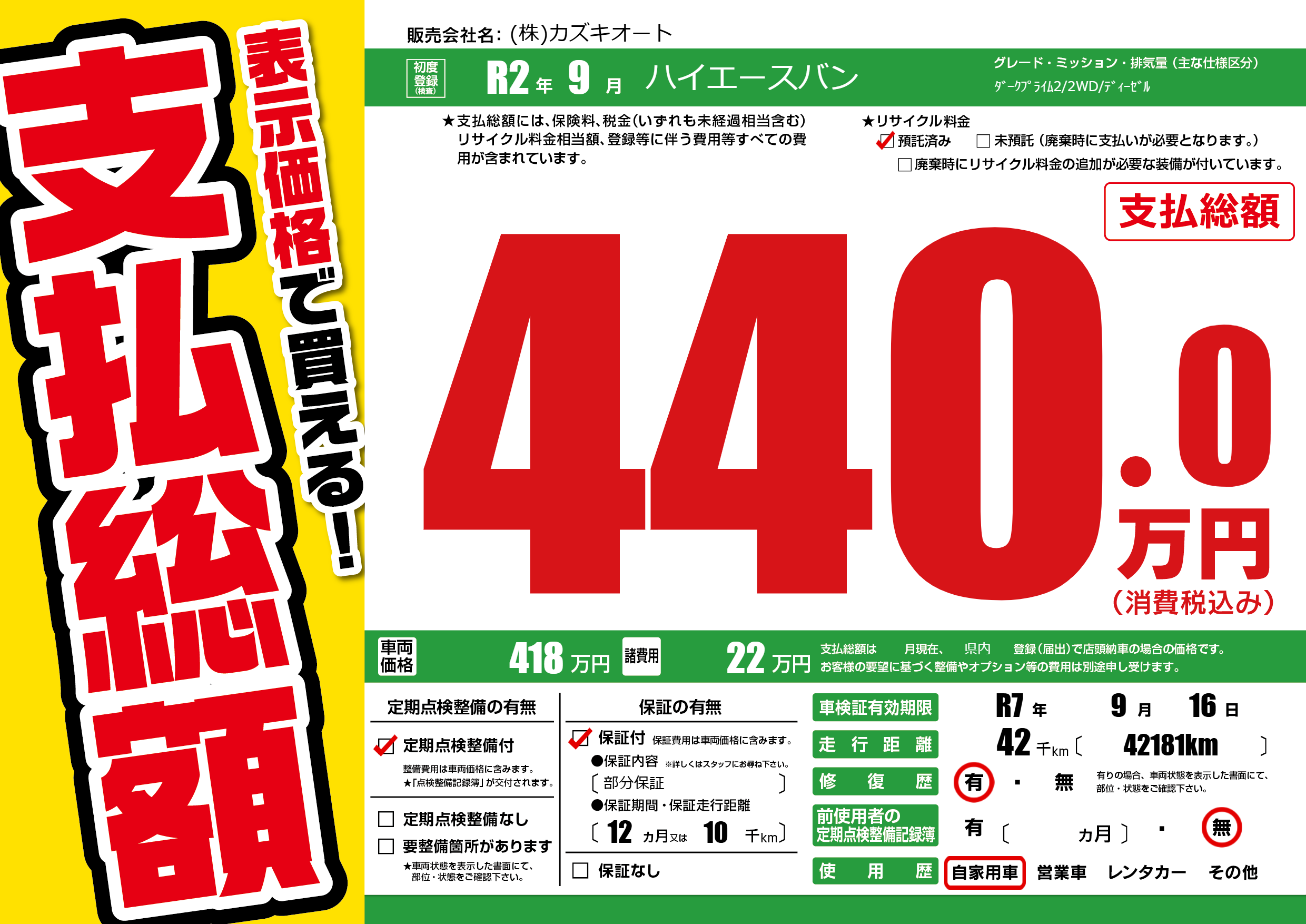 | 走行キロ | 4.2万km | 初年度登録 | R2年9月 |