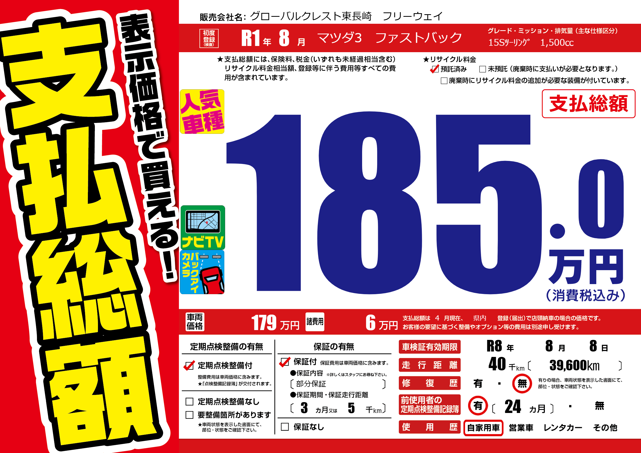 | 走行キロ | 4万km | 初年度登録 | R1年8月 |