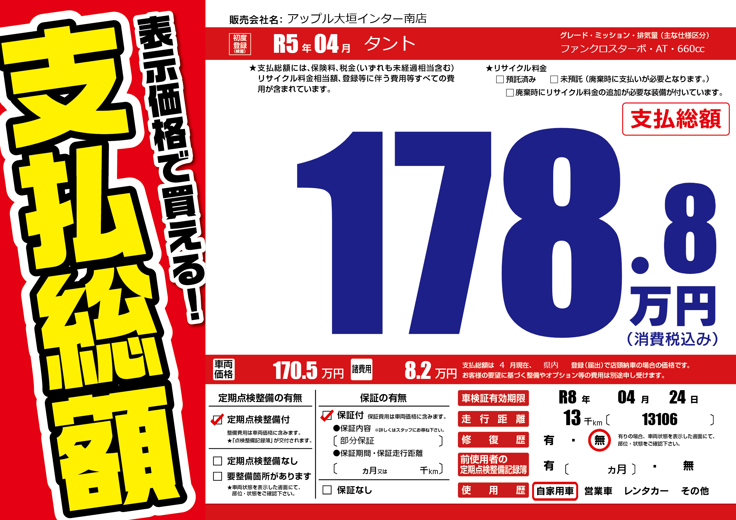 | 走行キロ | 1.3万km | 初年度登録 | R5年04月 |