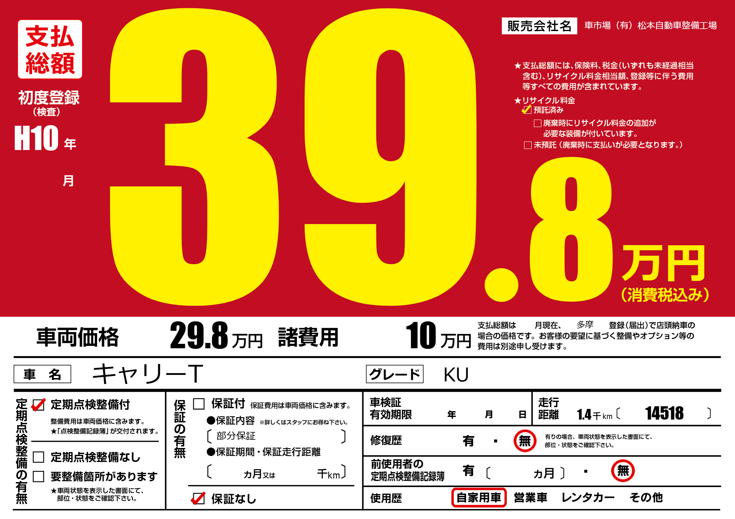 | 車名 | キャリーT | グレード ミッション 排気量 |