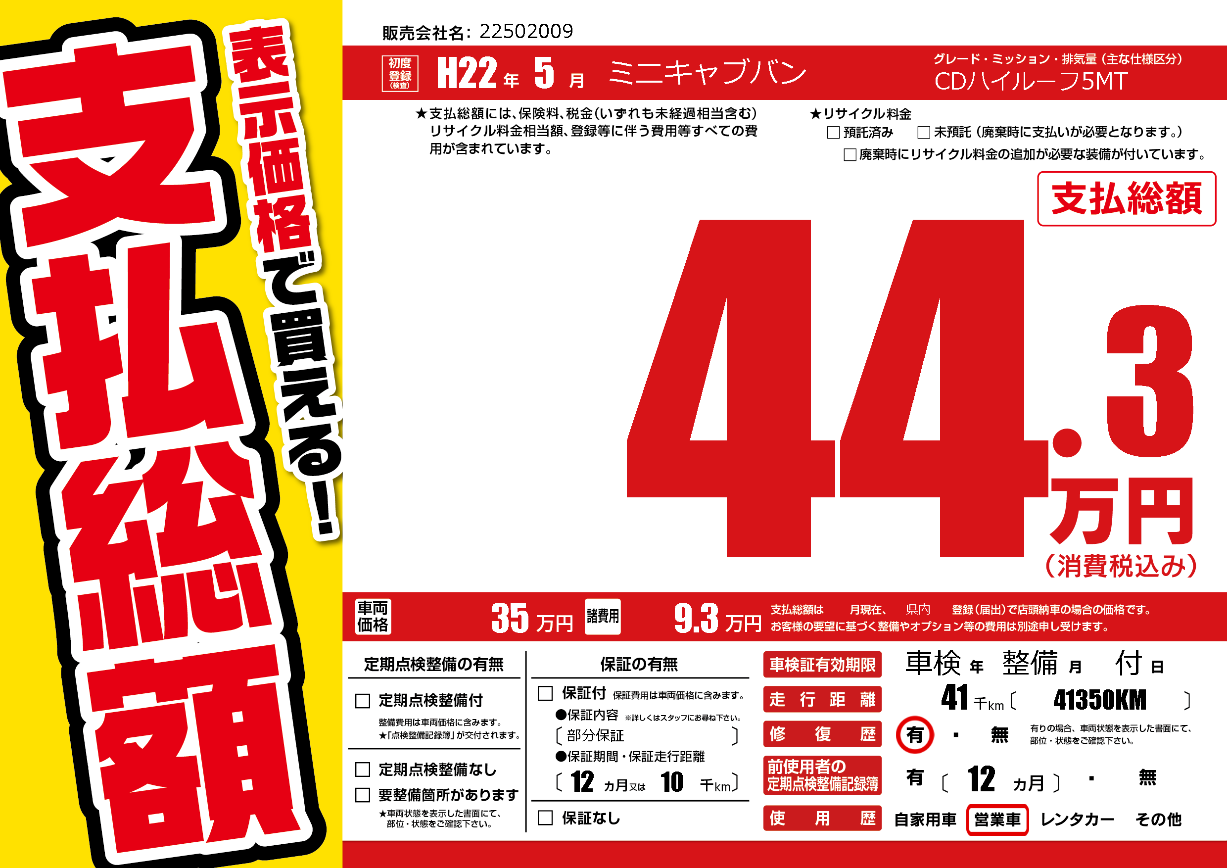 | 走行キロ | 4.1万km | 初年度登録 | H22年5月 |