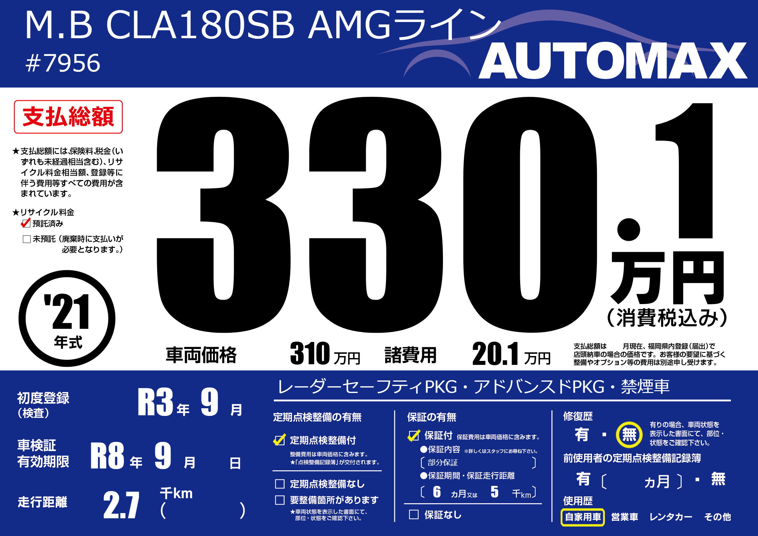 | 車名 | M.B CLA180SB AMGライン | グレード ミッション 排気量 |