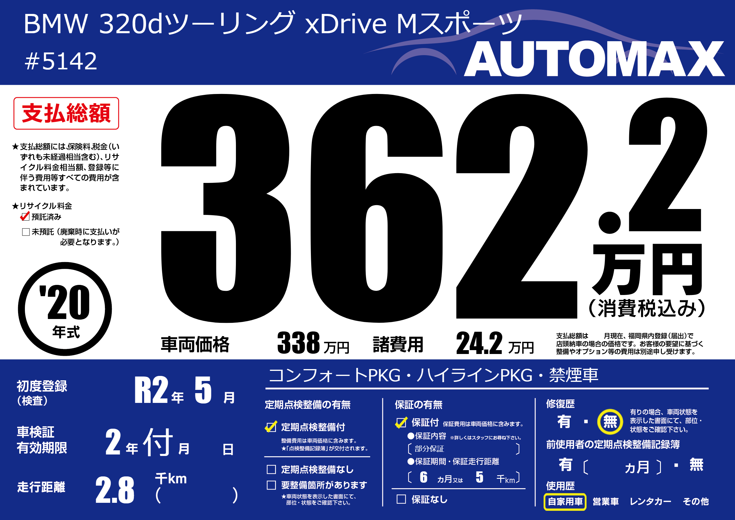 | 車名 | BMW 320dツーリング xDrive Mスポーツ | グレード ミッション 排気量 |