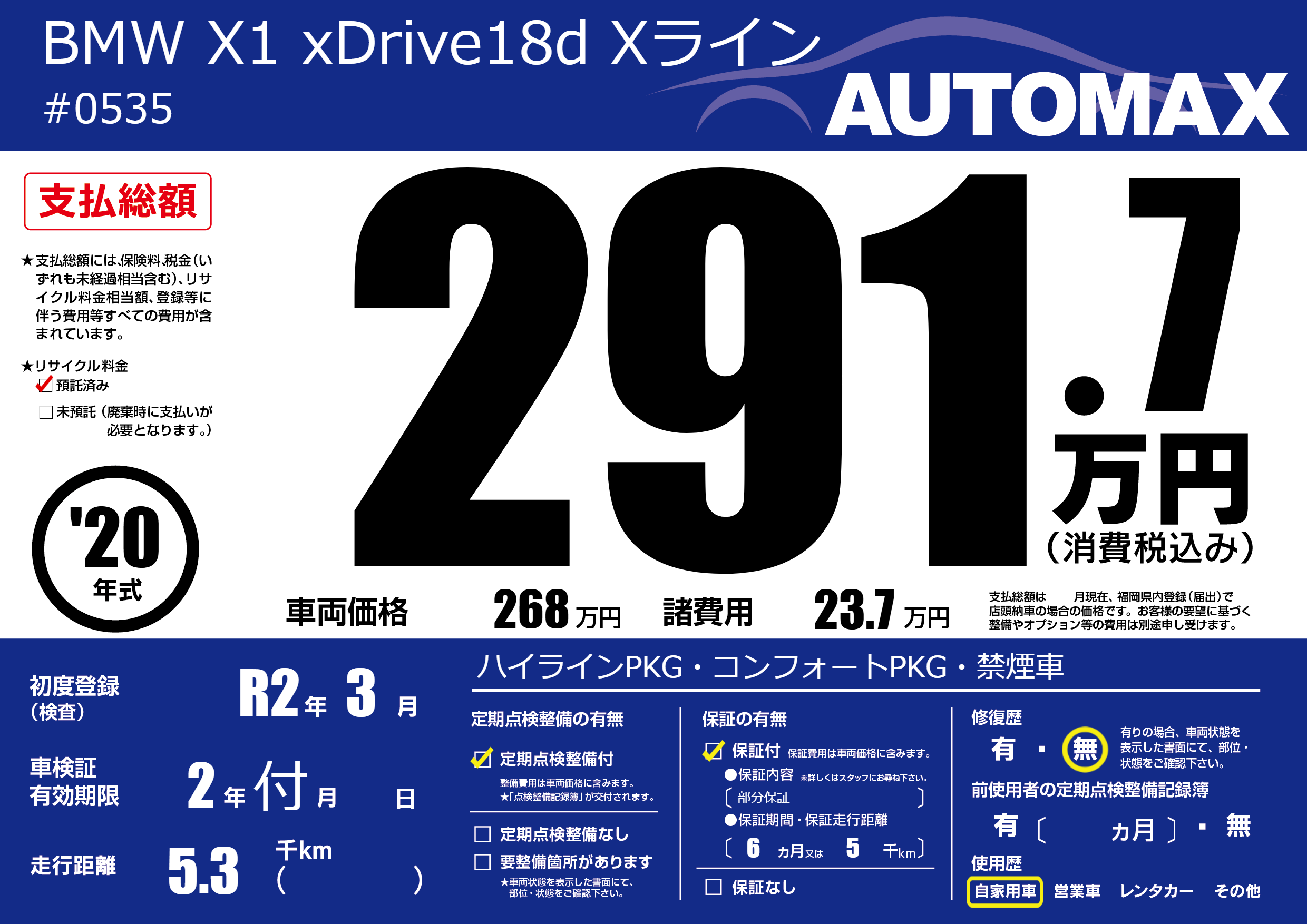 | 車名 | BMW X1 xDrive18d Xライン | グレード ミッション 排気量 |