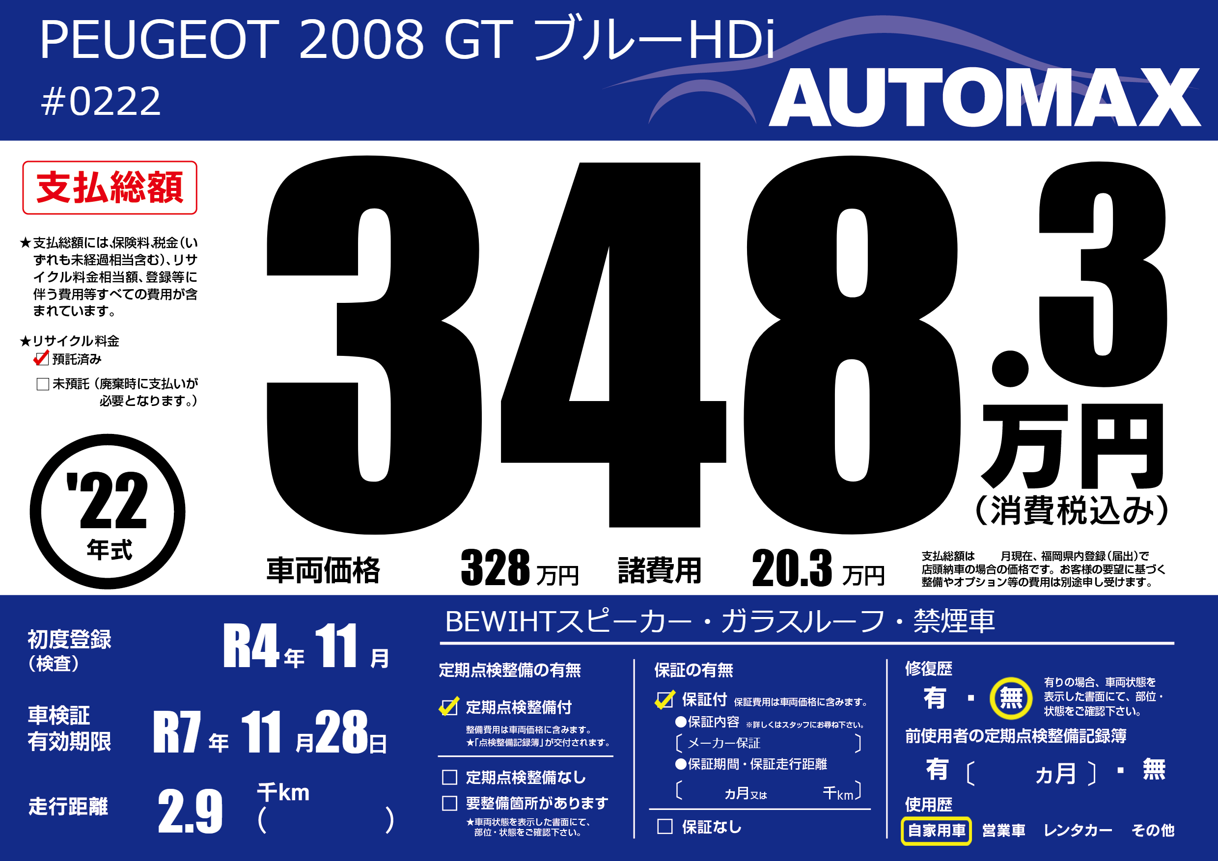 | 車名 | PEUGEOT 2008 GT ブルーHDi | グレード ミッション 排気量 |
