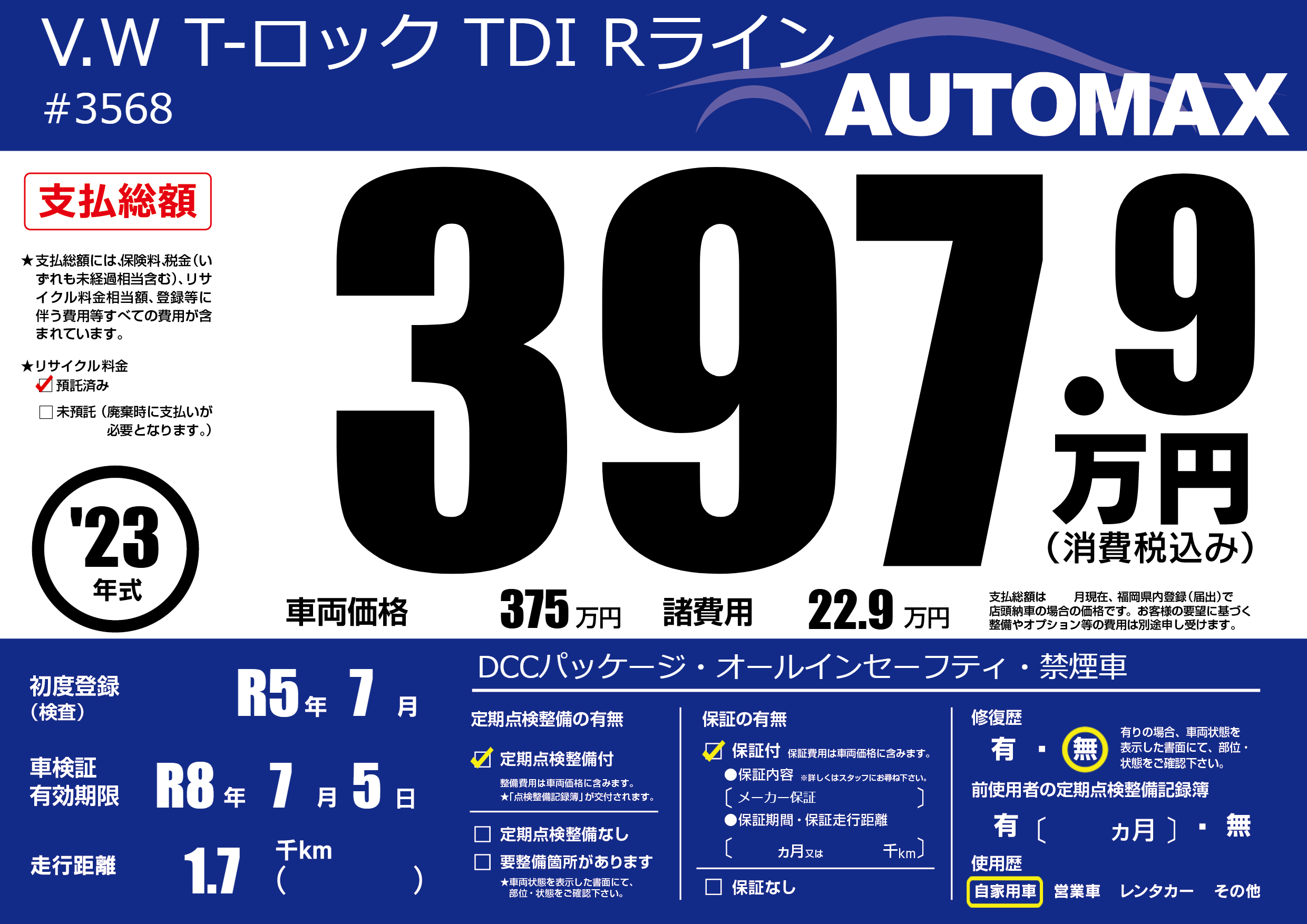 | 車名 | V.W T-ロック TDI Rライン | グレード ミッション 排気量 |