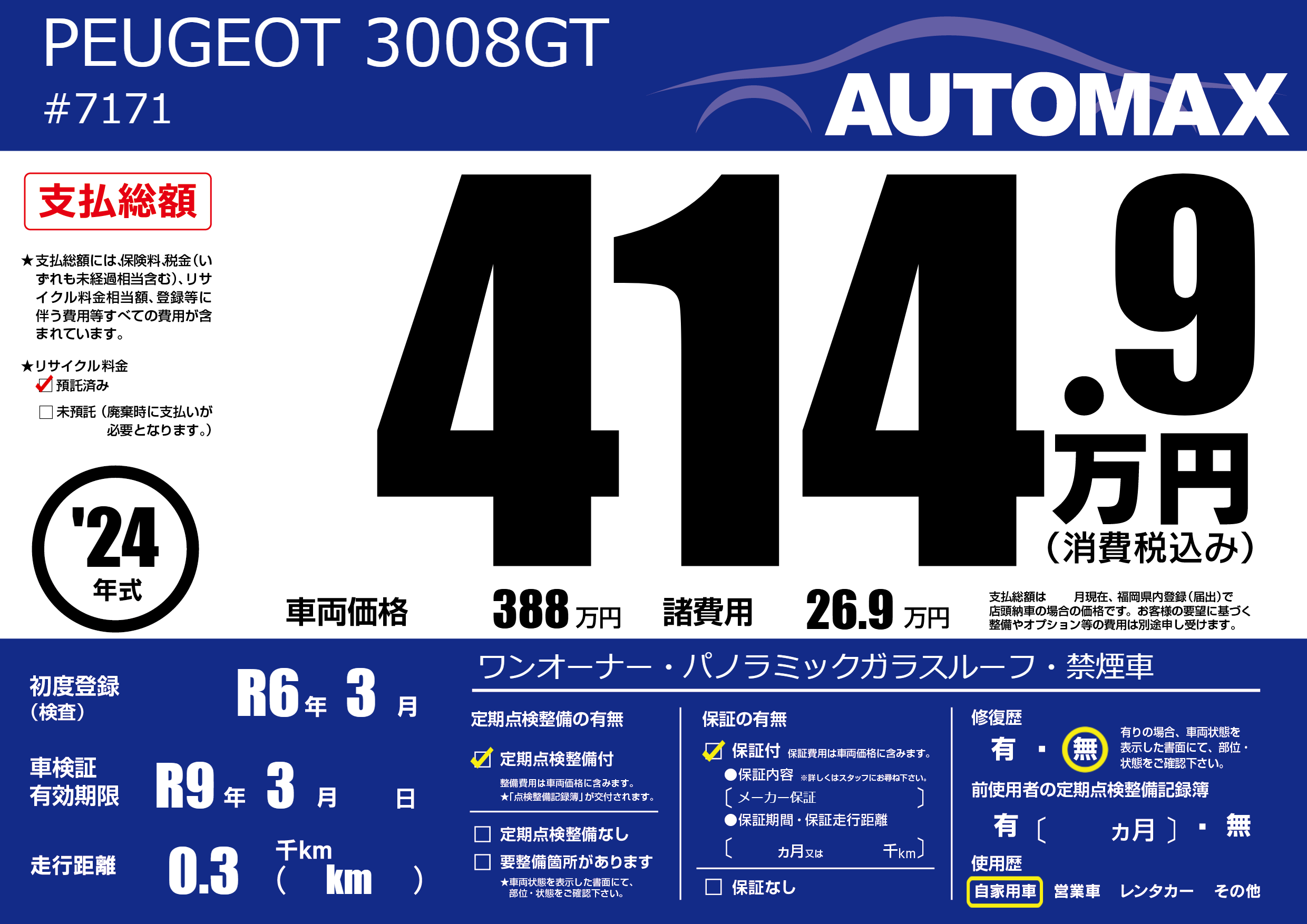 | 車名 | PEUGEOT 3008GT | グレード ミッション 排気量 |