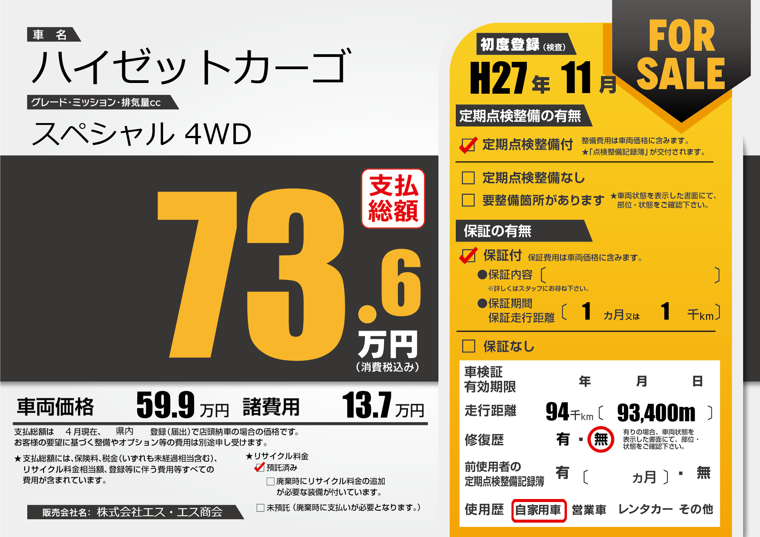 | 走行キロ | 9.4万km | 初年度登録 | H27年11月 |