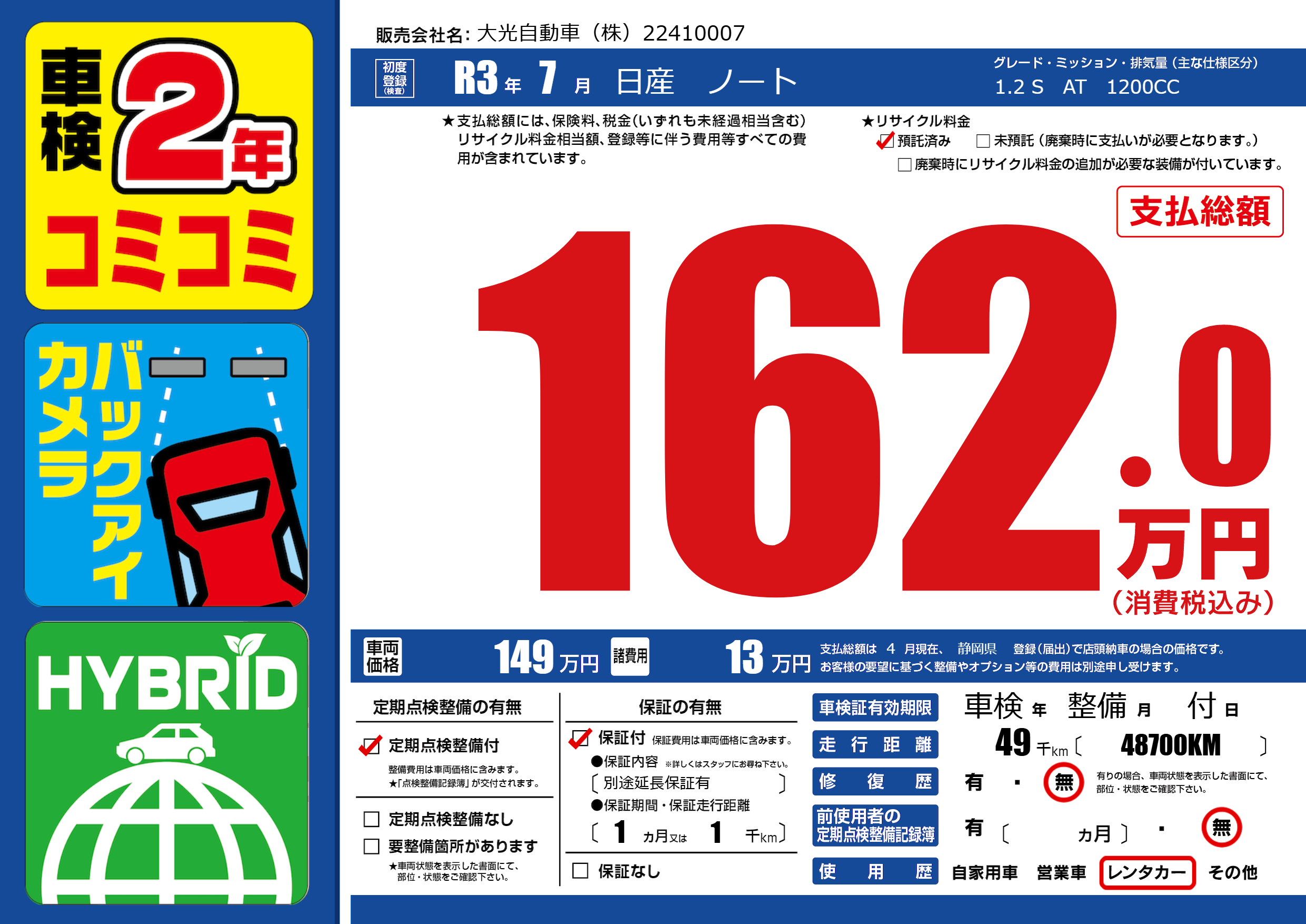| 車名 | 日産 ノート | グレード ミッション 排気量 |
