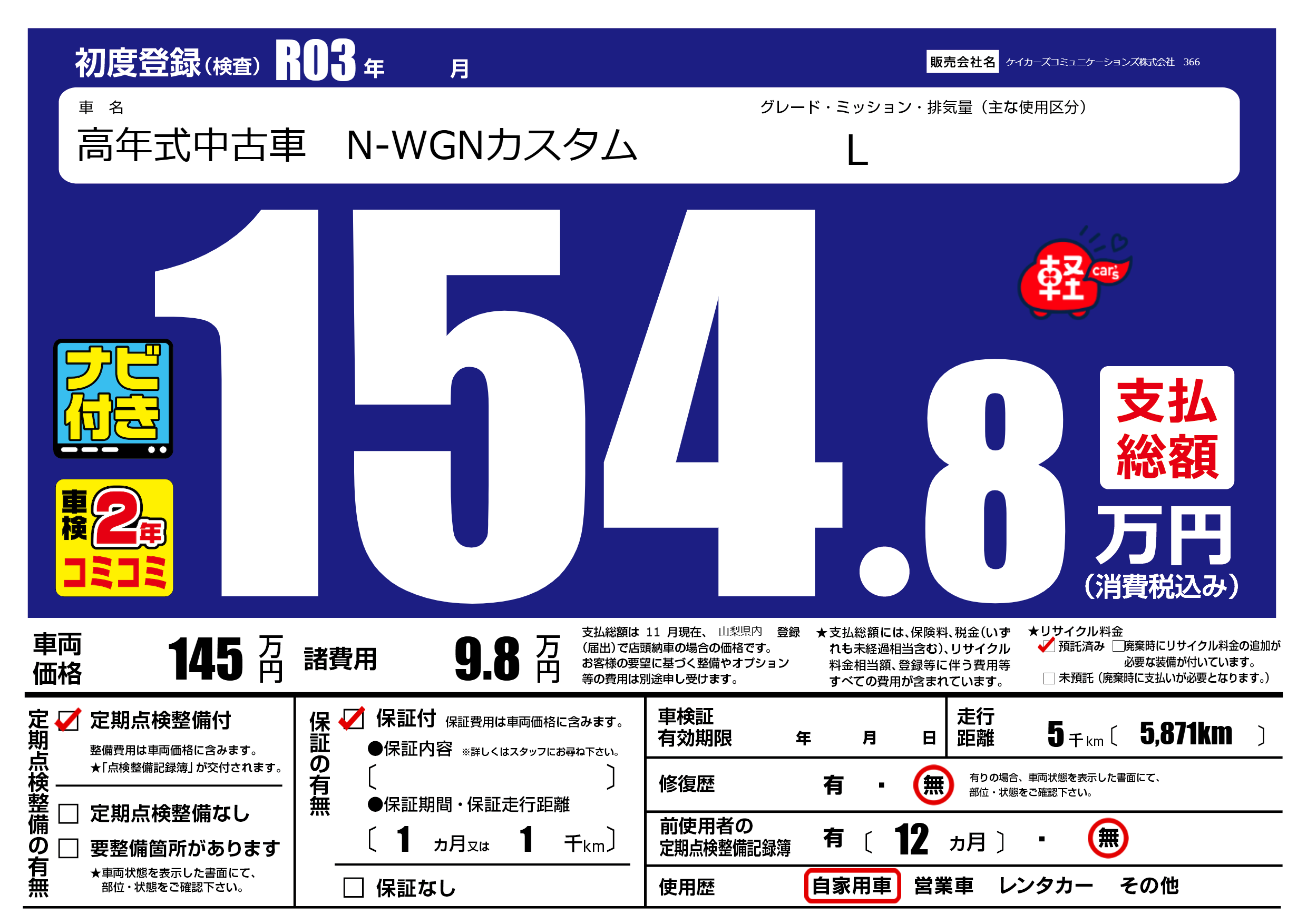 | 車名 | 高年式中古車 N-WGNカスタム | グレード ミッション 排気量 |