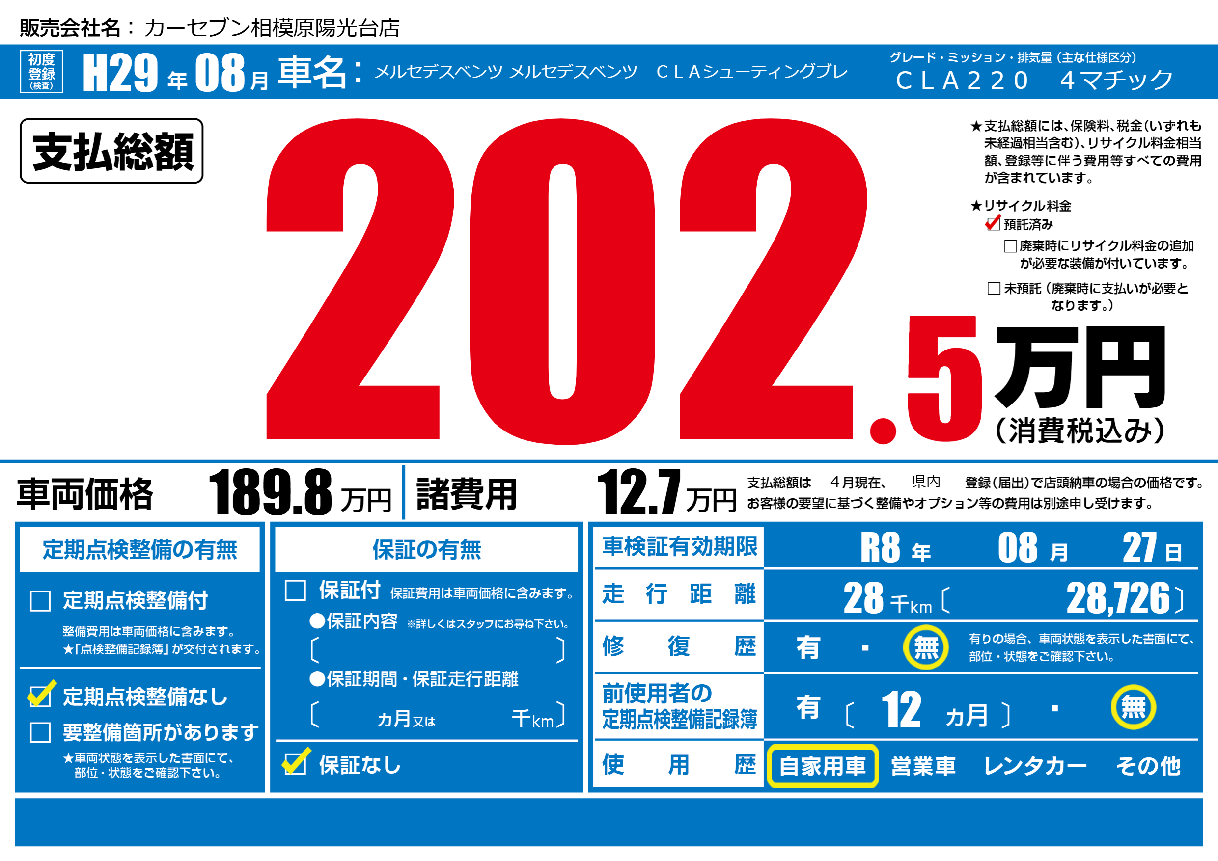 | 車名 | メルセデスベンツ メルセデスベンツ CLAシューティングブレ | グレード ミッション 排気量 |