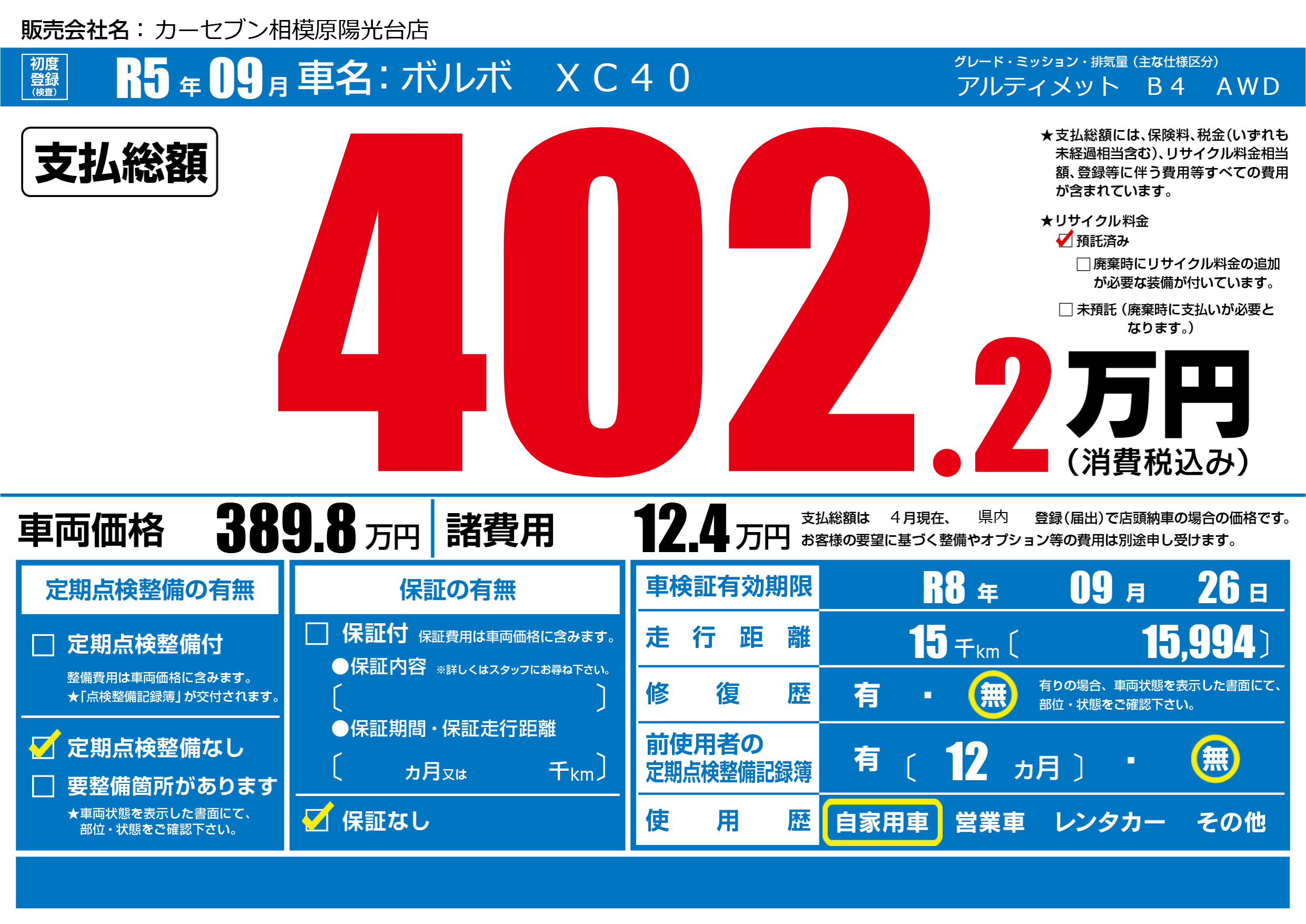 | 車名 | ボルボ XC40 | グレード ミッション 排気量 |