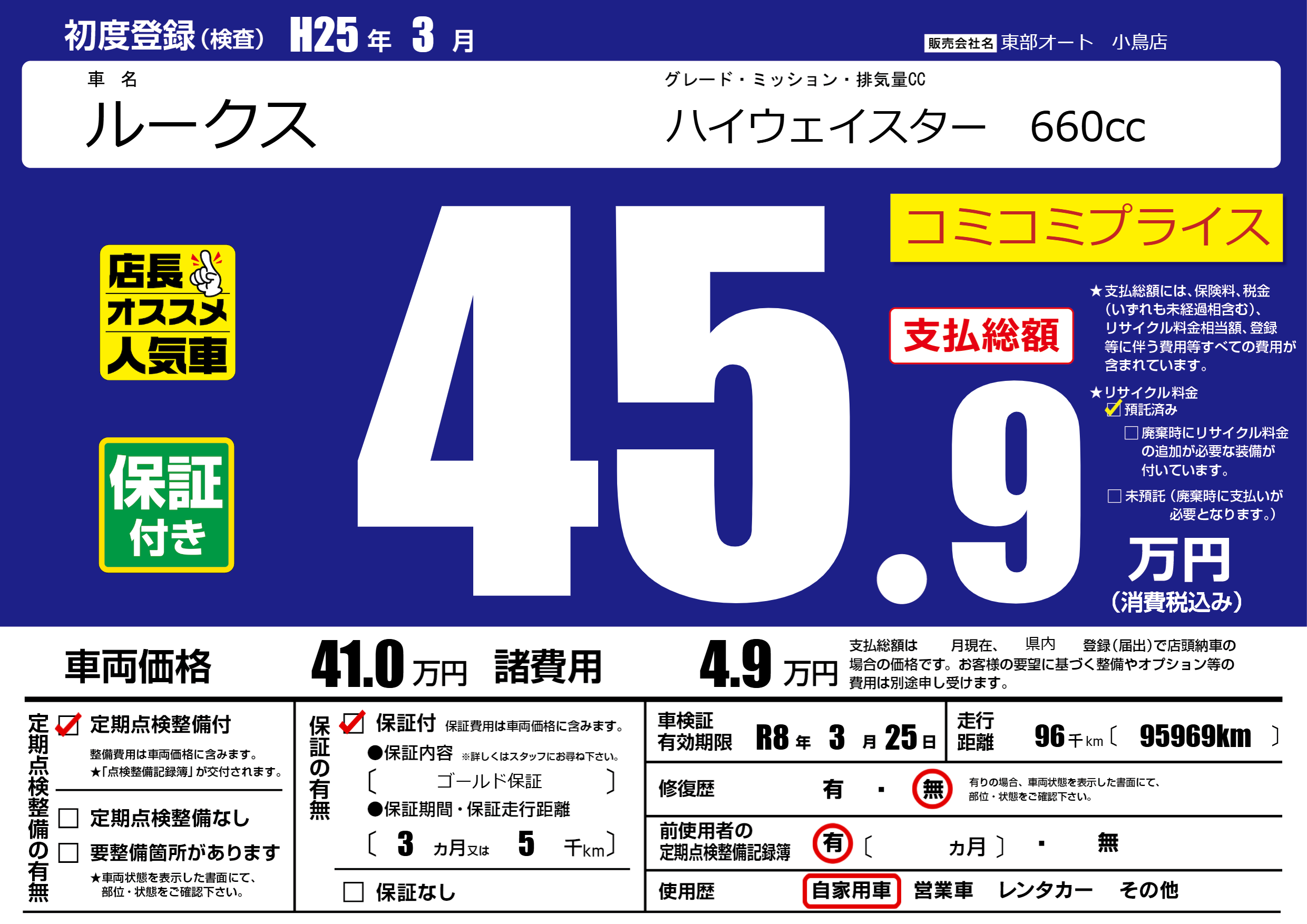 | 走行キロ | 9.6万km | 初年度登録 | H25年3月 |