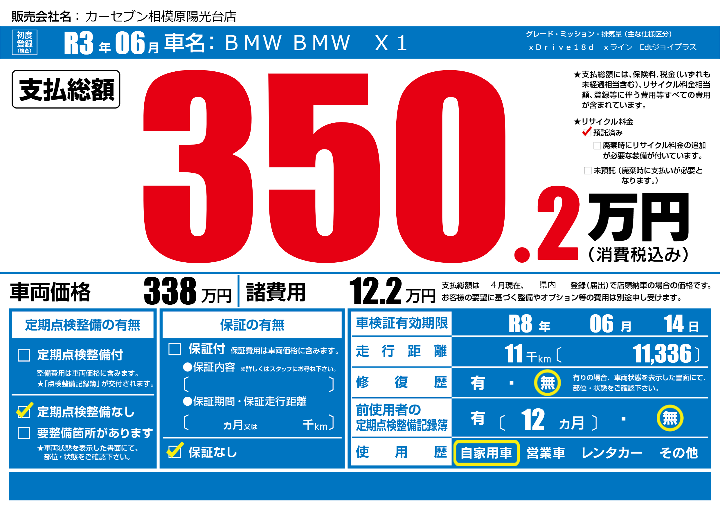 | 車名 | BMW BMW X1 | グレード ミッション 排気量 |