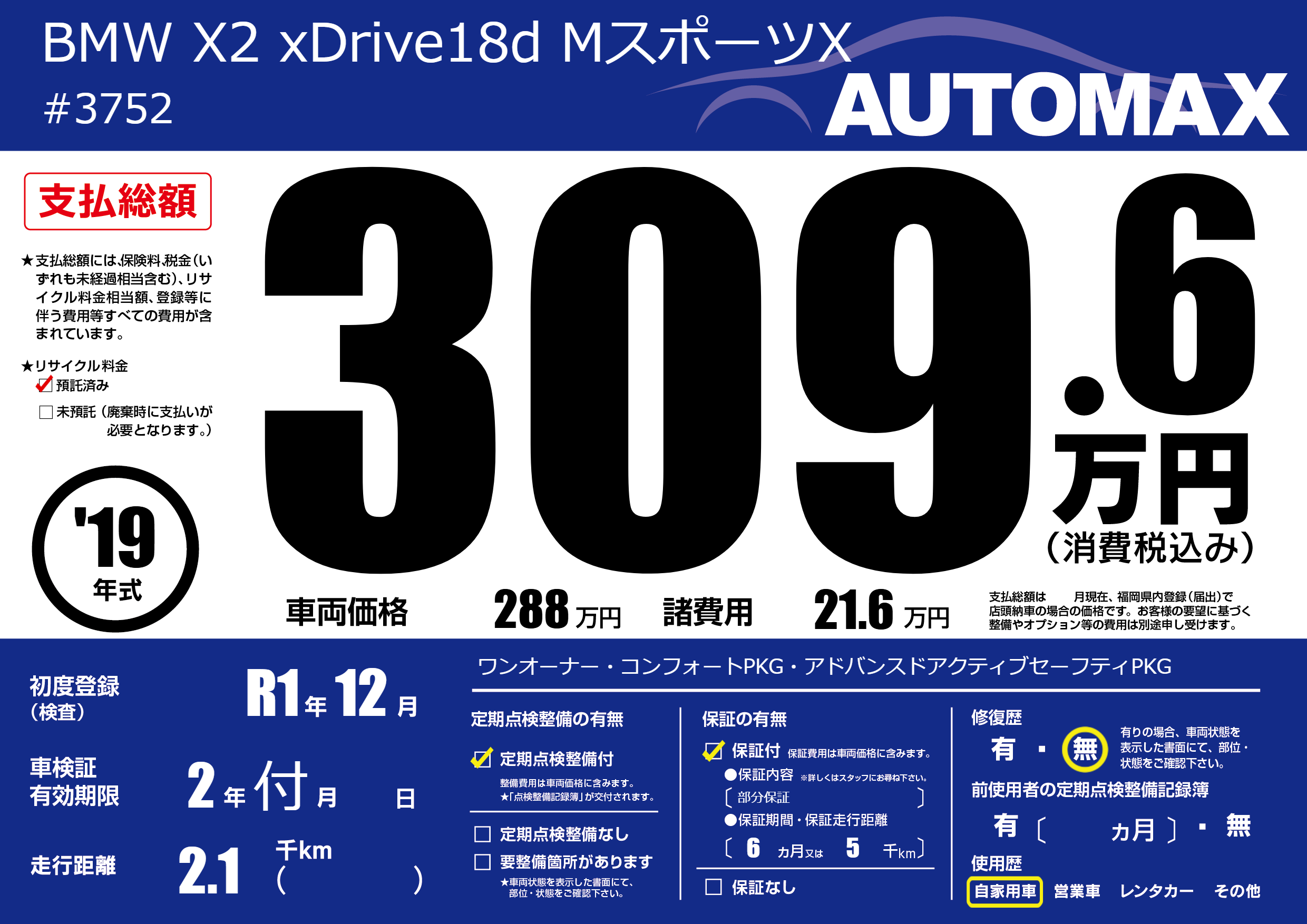 | 車名 | BMW X2 xDrive18d MスポーツX | グレード ミッション 排気量 |