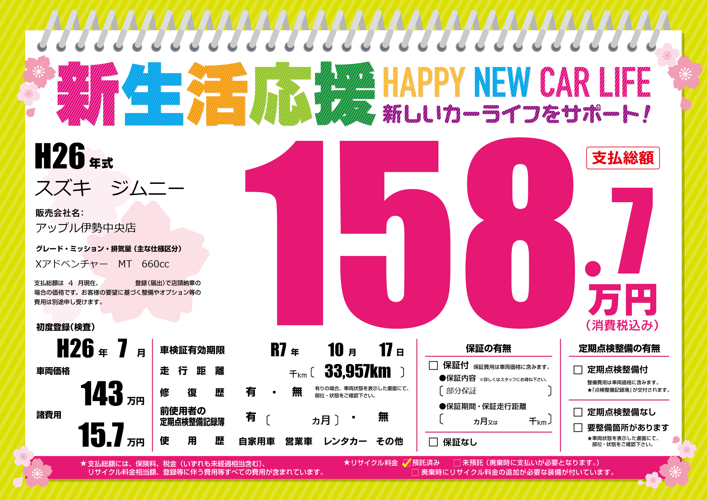 | 車名 | スズキ ジムニー | グレード ミッション 排気量 |