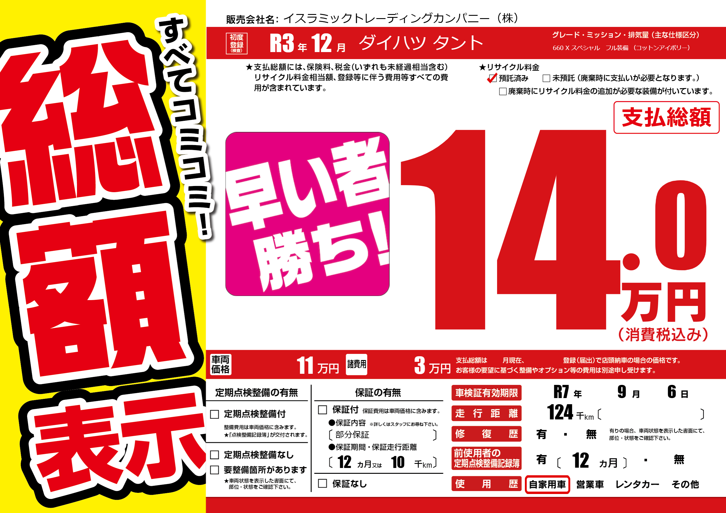 | 車名 | ダイハツ タント | グレード ミッション 排気量 |