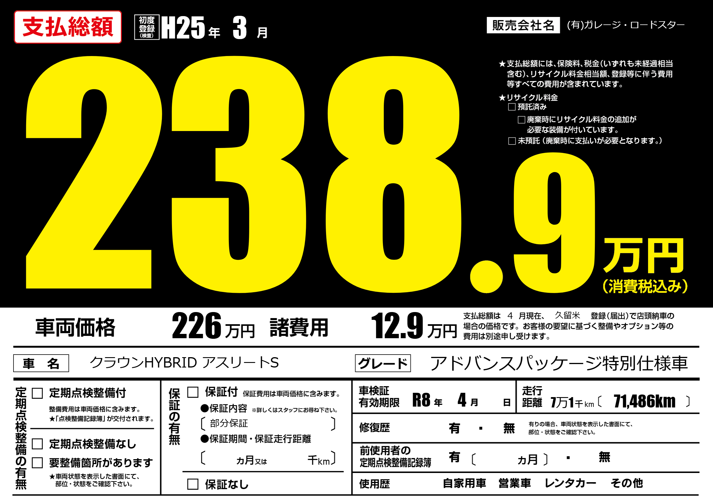 | 車名 | クラウンHYBRID アスリートS | グレード ミッション 排気量 |