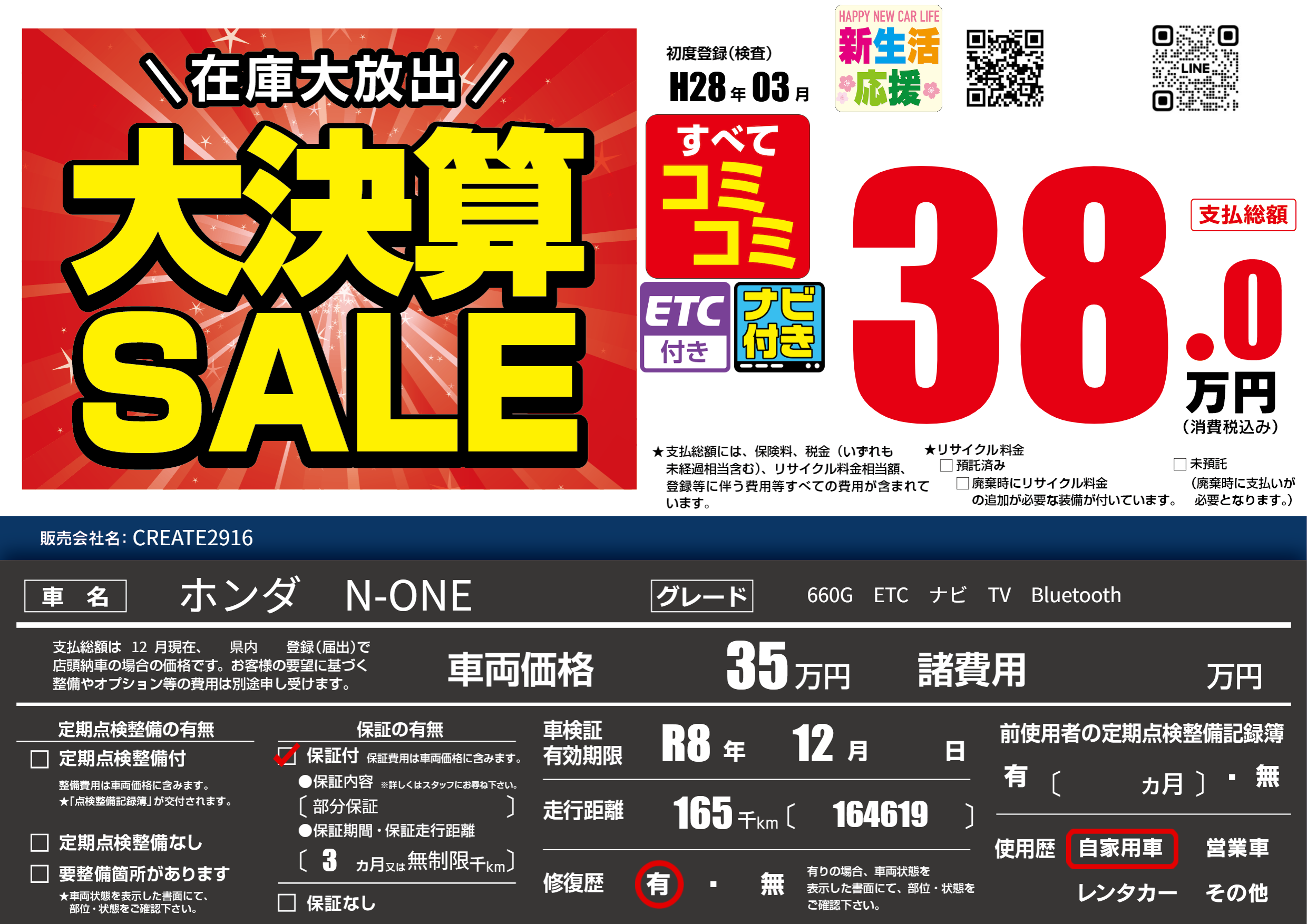 | 車名 | ホンダ N-ONE | グレード ミッション 排気量 |