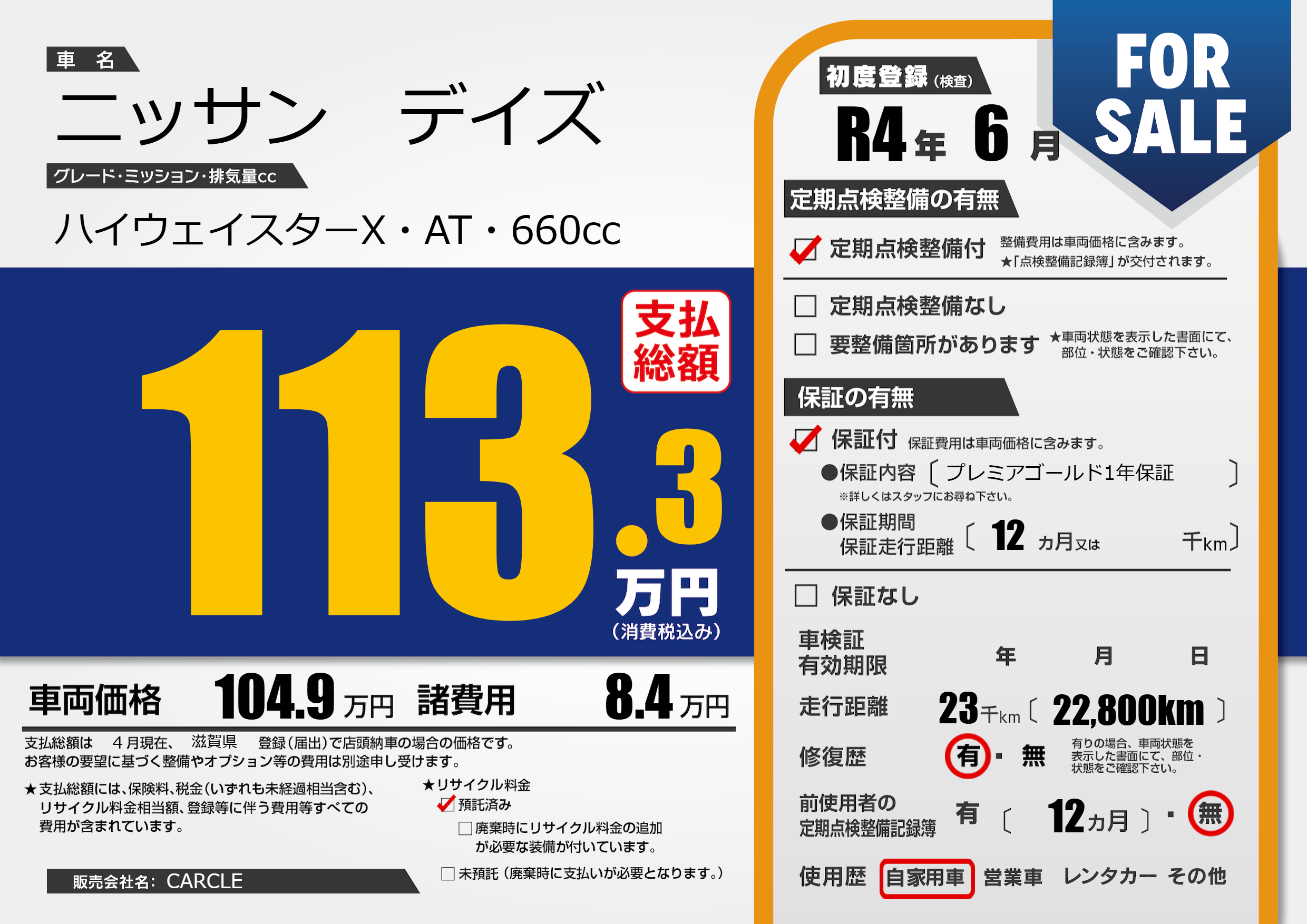 | 車名 | ニッサン デイズ | グレード ミッション 排気量 |