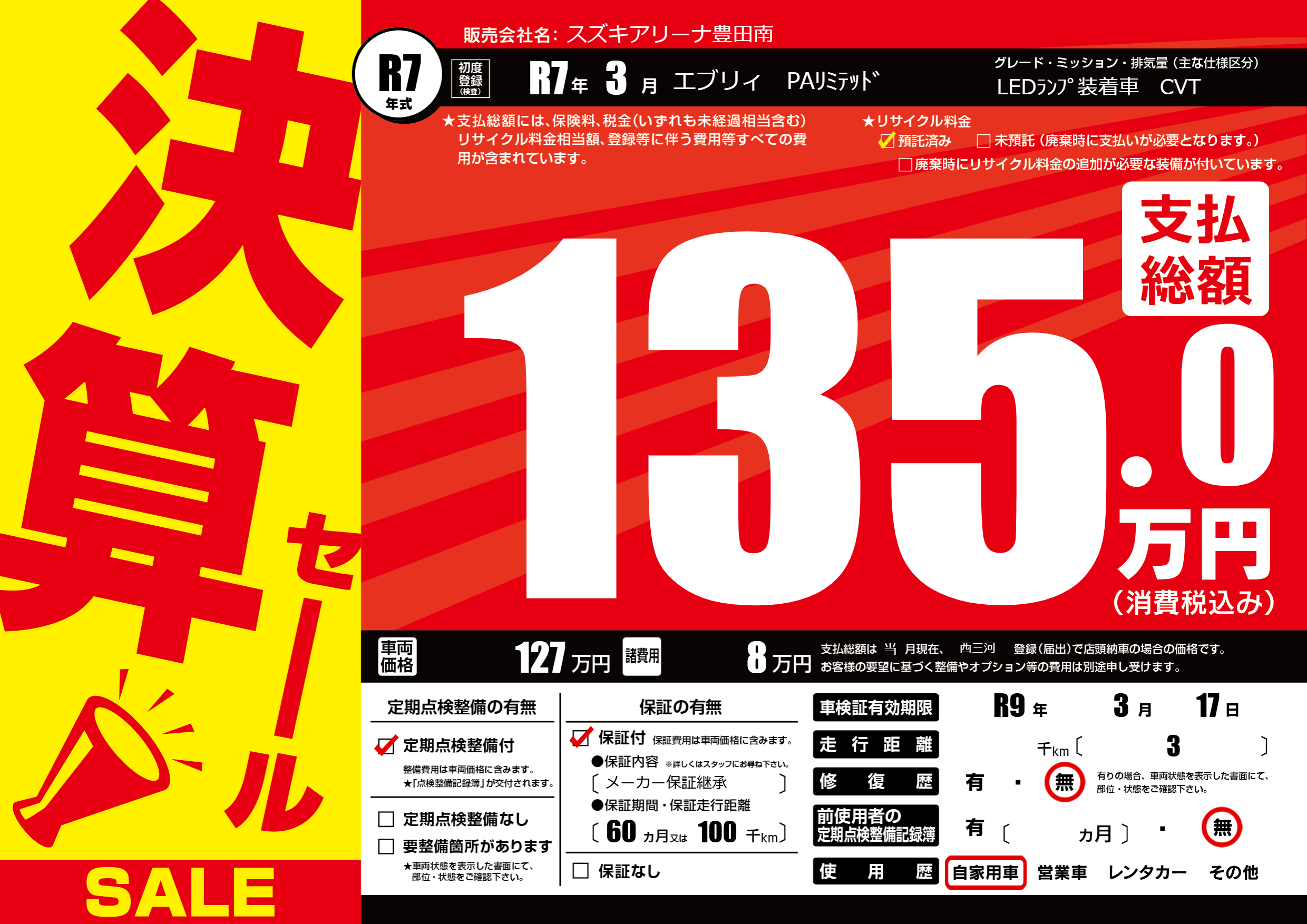 | 車名 | エブリィ PAリミテッド | グレード ミッション 排気量 |