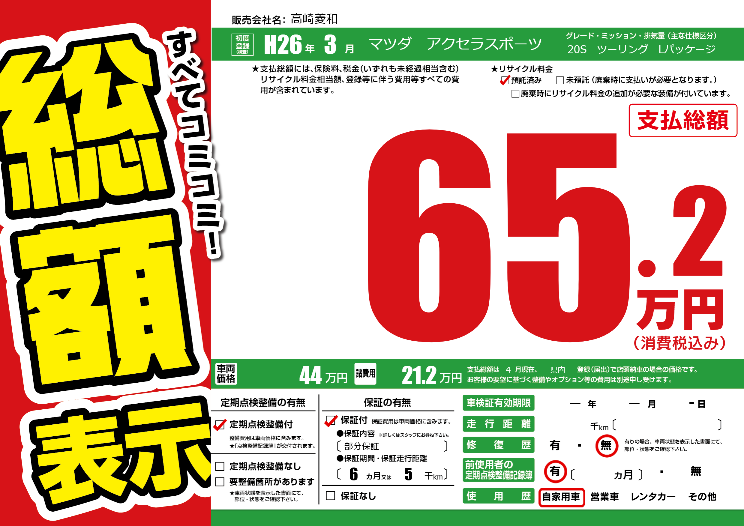 | 車名 | マツダ アクセラスポーツ | グレード ミッション 排気量 |